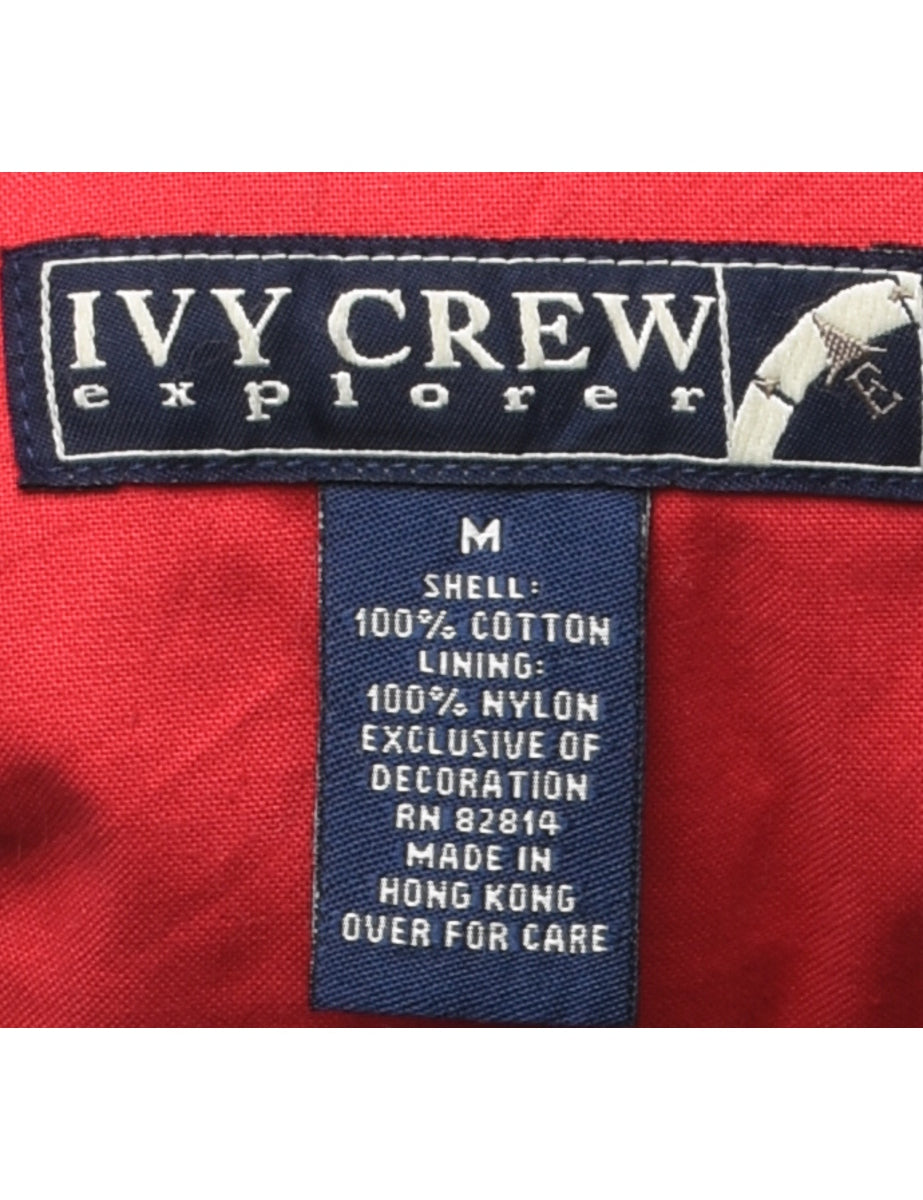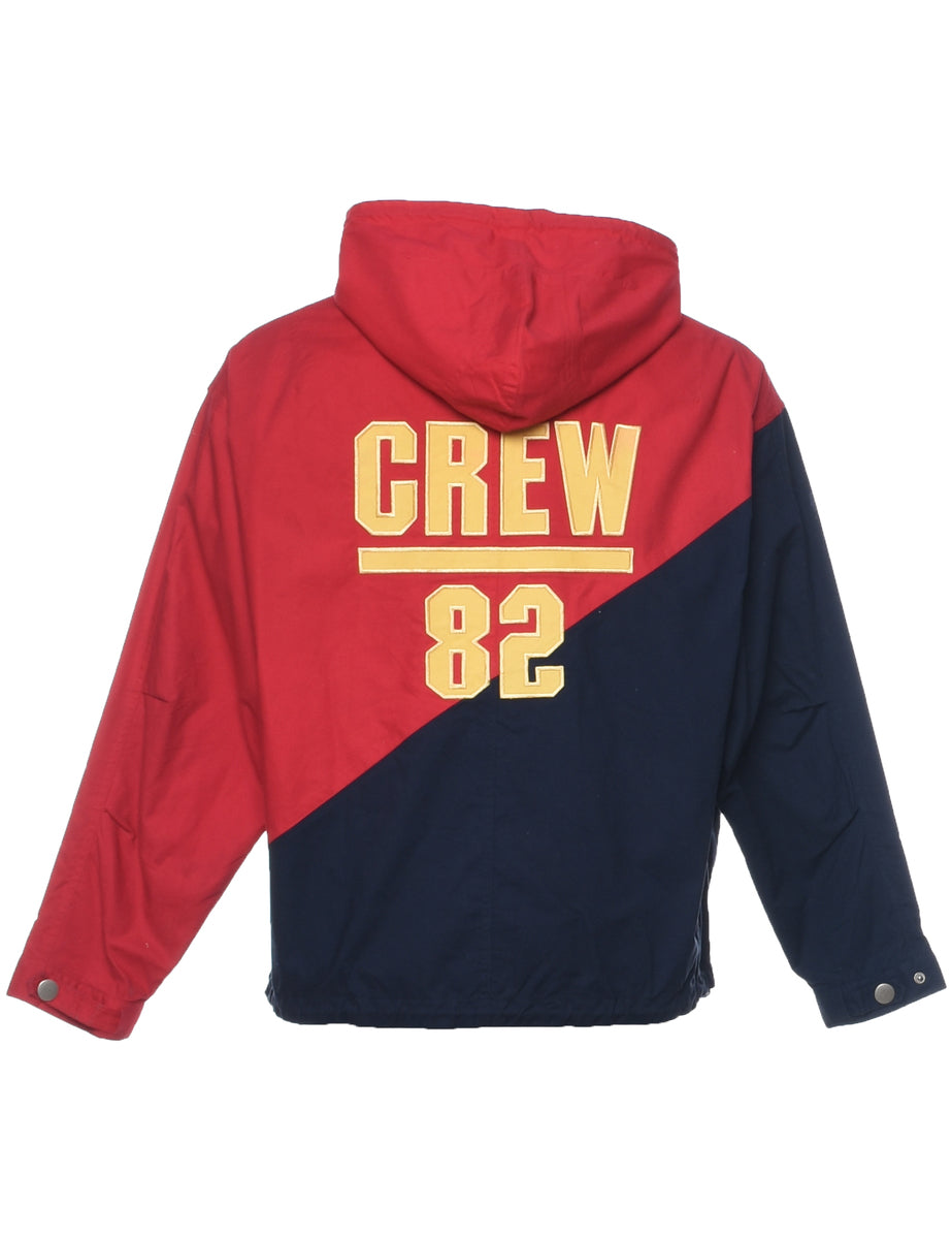Two tone jacket comes in navy & red with a hood and multiple pockets.