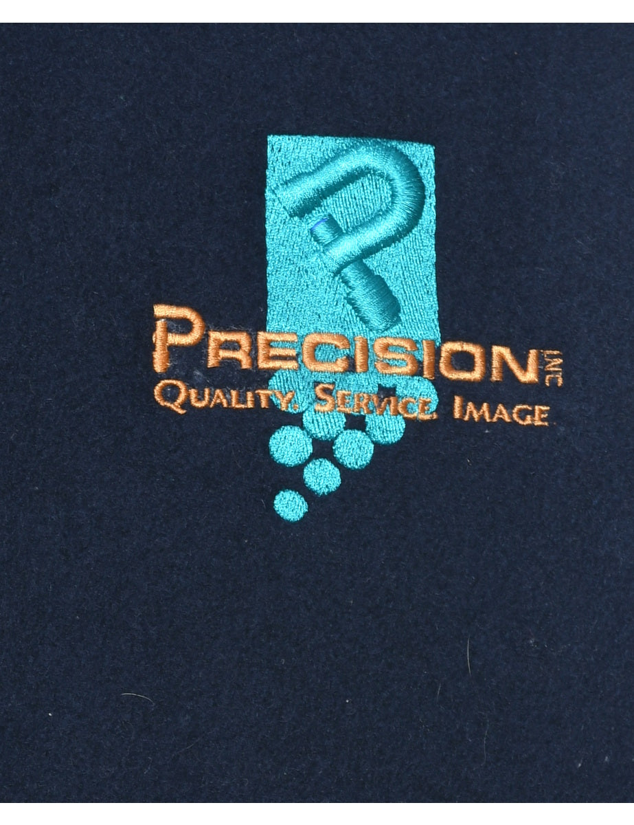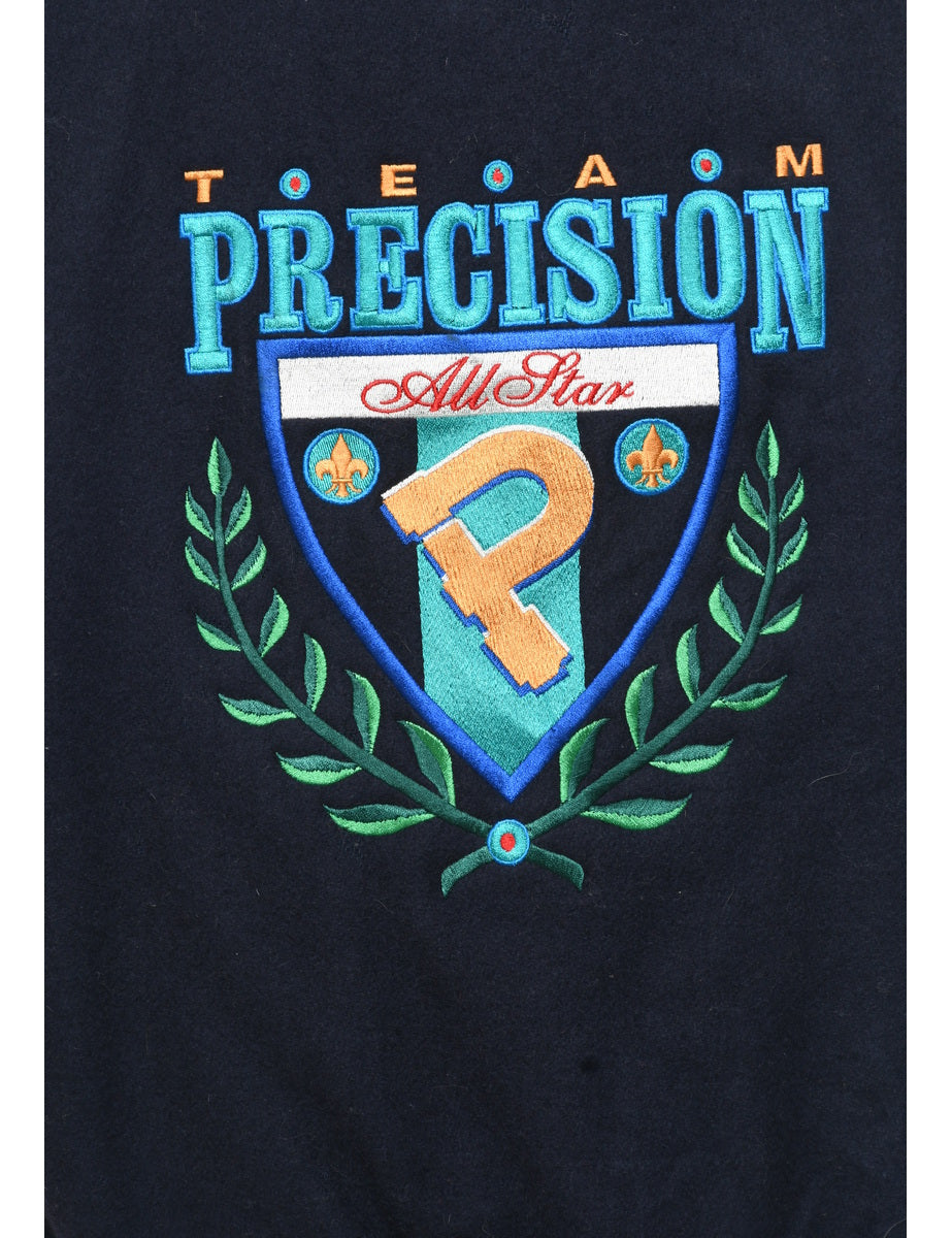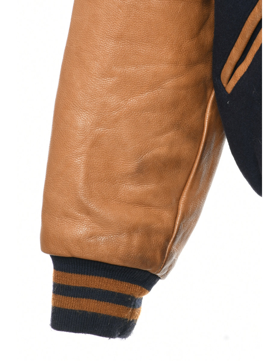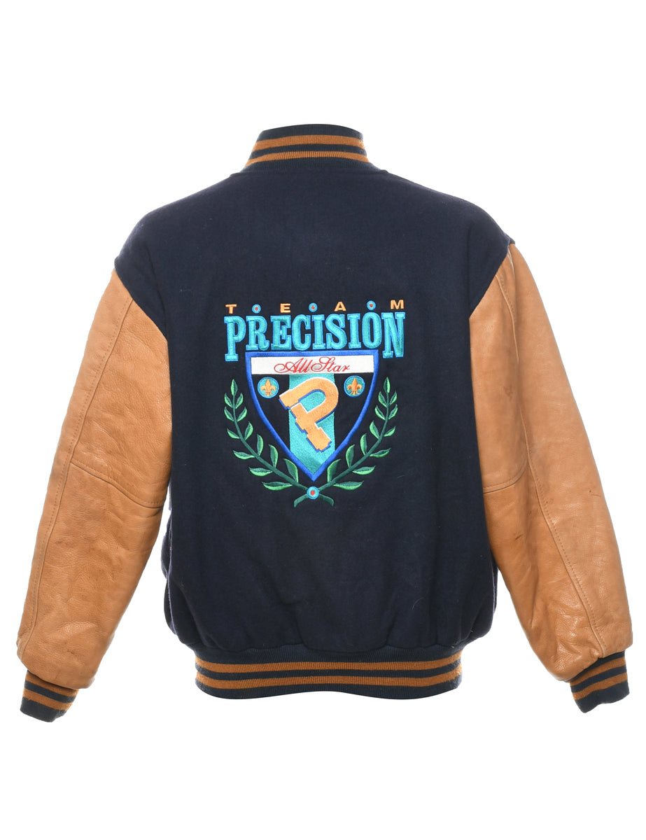 Team jacket comes in navy & mustard with multiple pockets and leather sleeves. Some stains on sleeve but otherwise good condition.