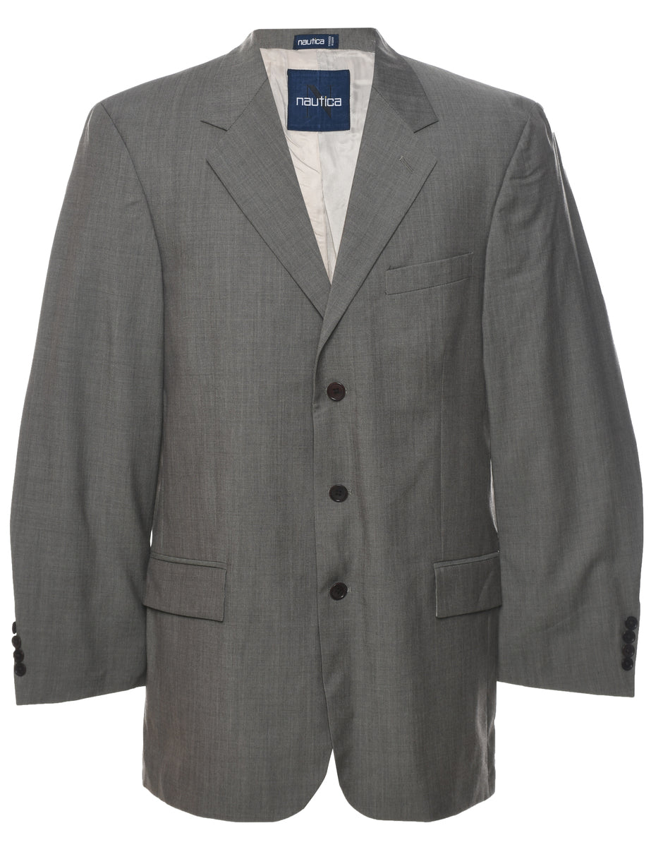 Button front blazer in grey with multiple pockets and shoulder pads. From the brand Nautica.