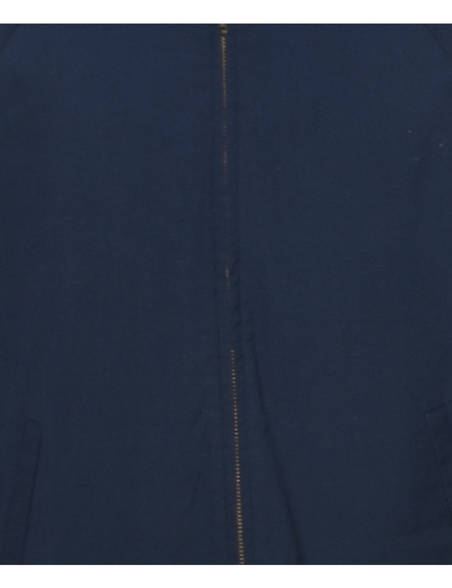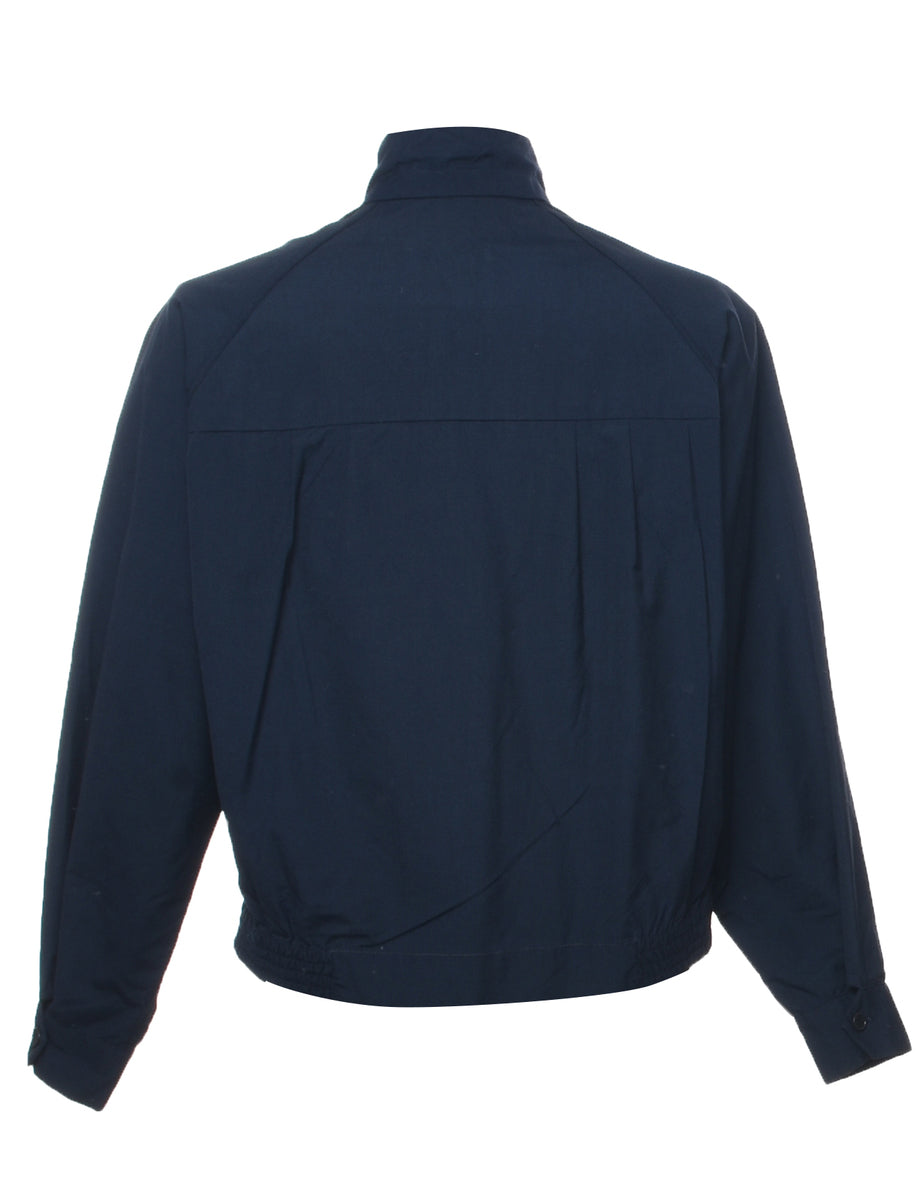 Zip front jacket comes in navy with multiple pockets and raglan sleeves.