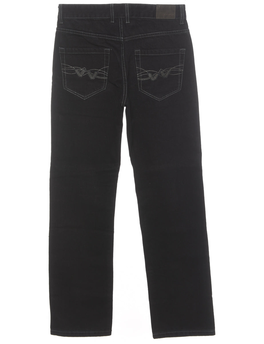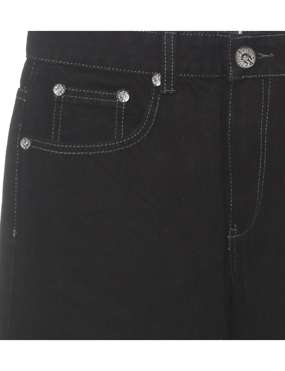 Straight fit jeans comes in black with contrast stitching and multiple pockets.