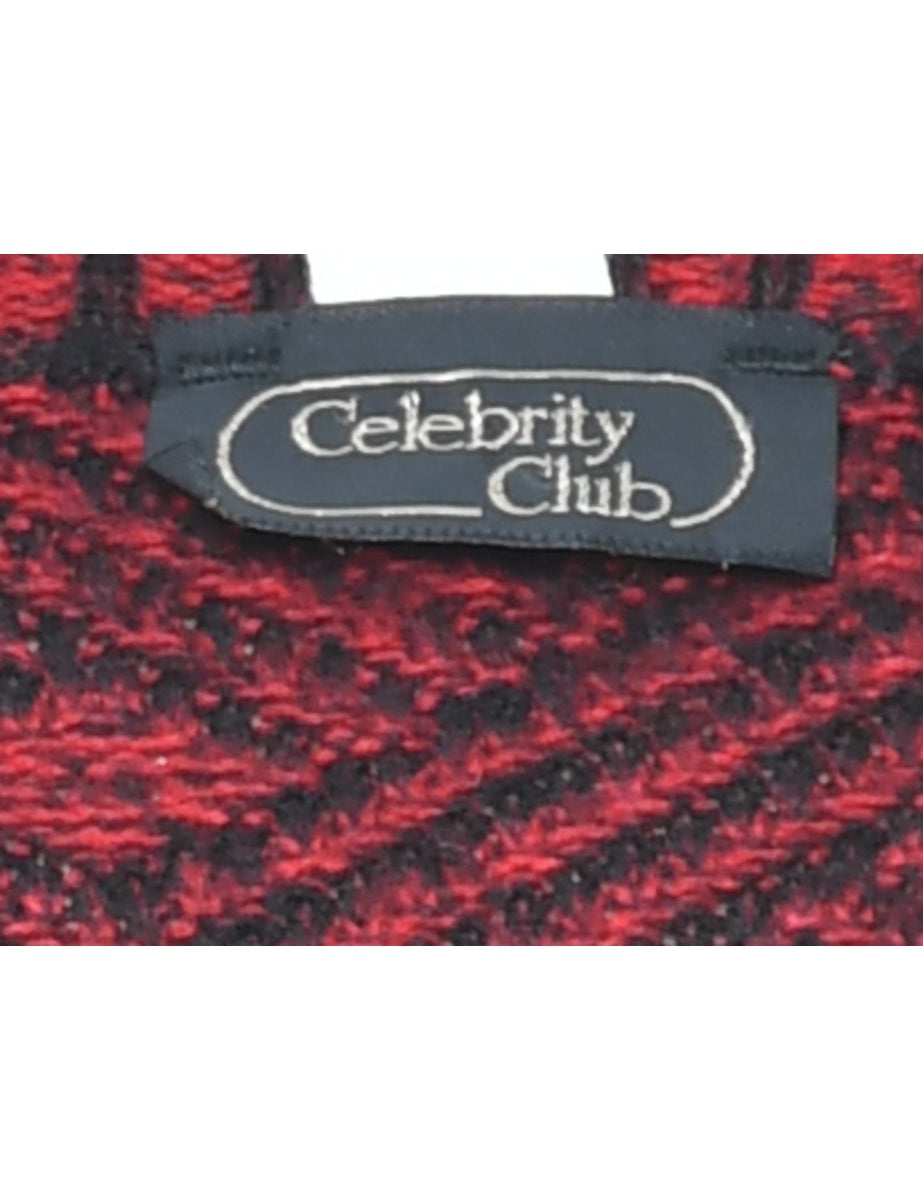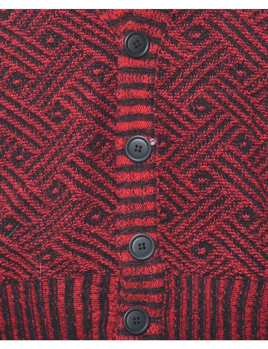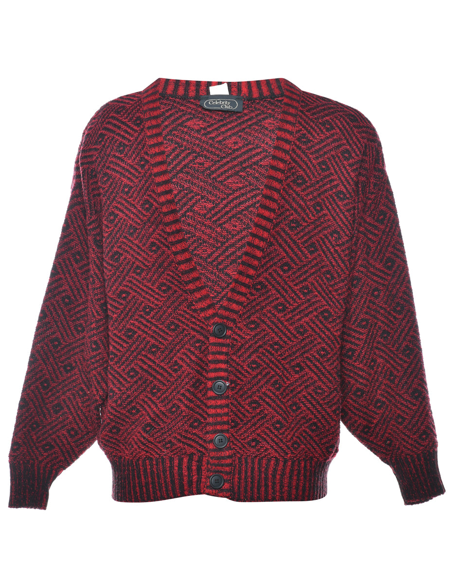 Geometric pattern cardigan comes in maroon with a v-neck.