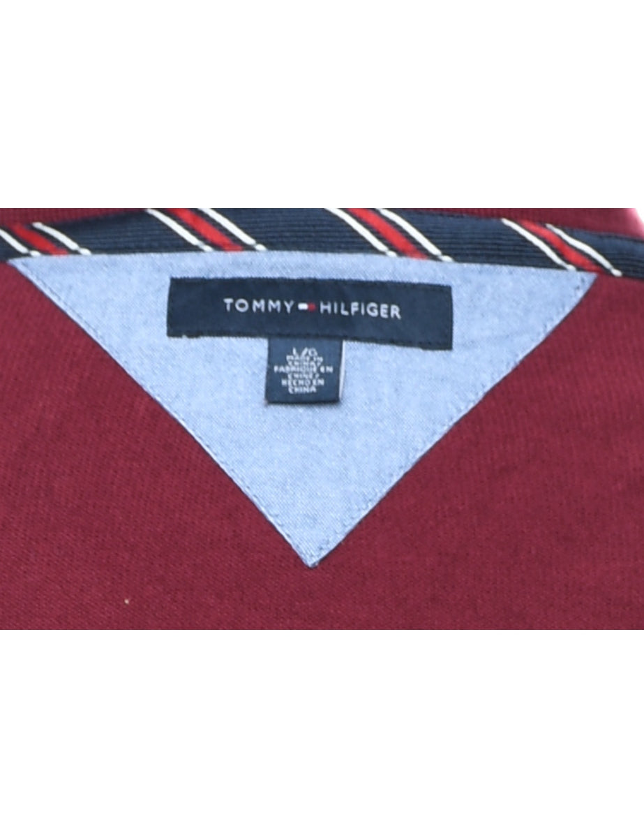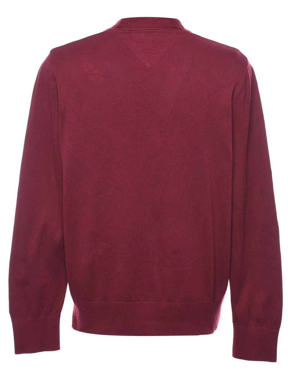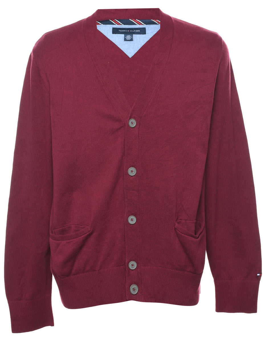 Tommy Hilfiger cardigan in maroon with a v-neck and multiple pockets.