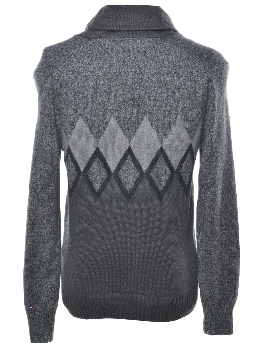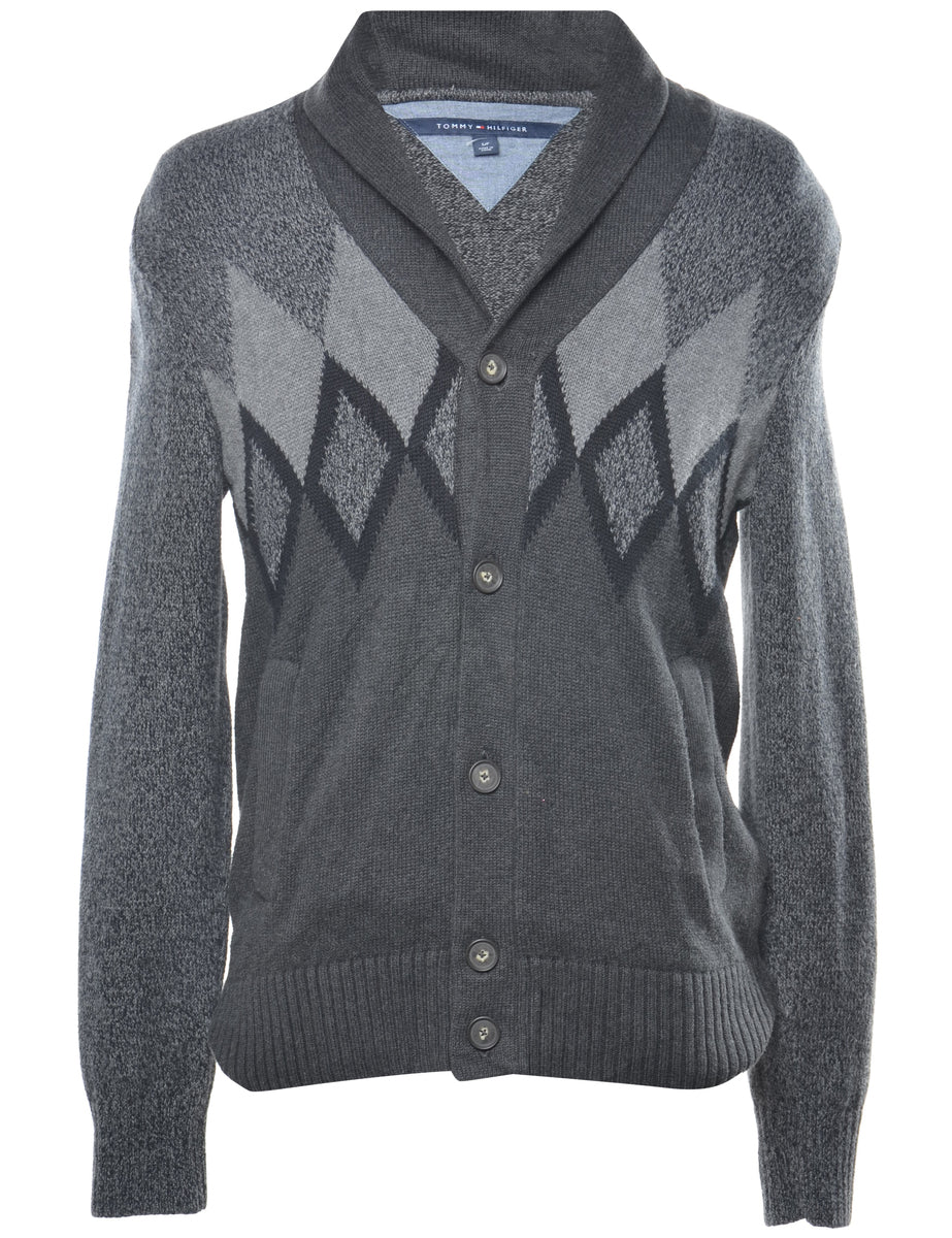 Harlequin pattern cardigan in dark grey with a shawl collar and multiple pockets.