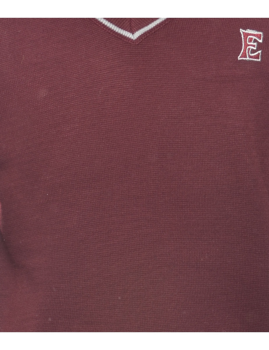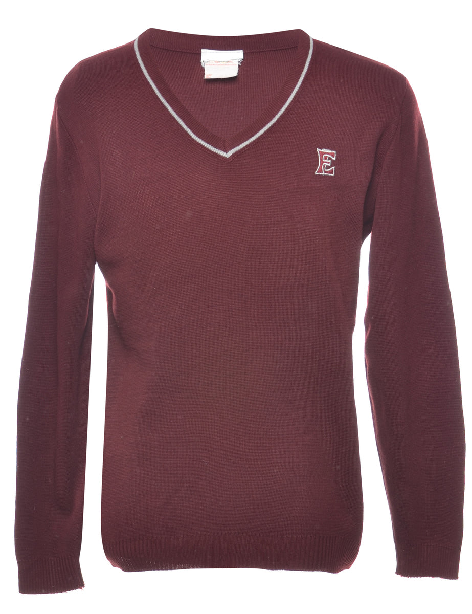 Long sleeved burgundy jumper with a v-neck and contrasting trim.