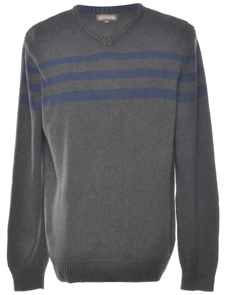 Long sleeved jumper comes in dark grey with a v-neck.