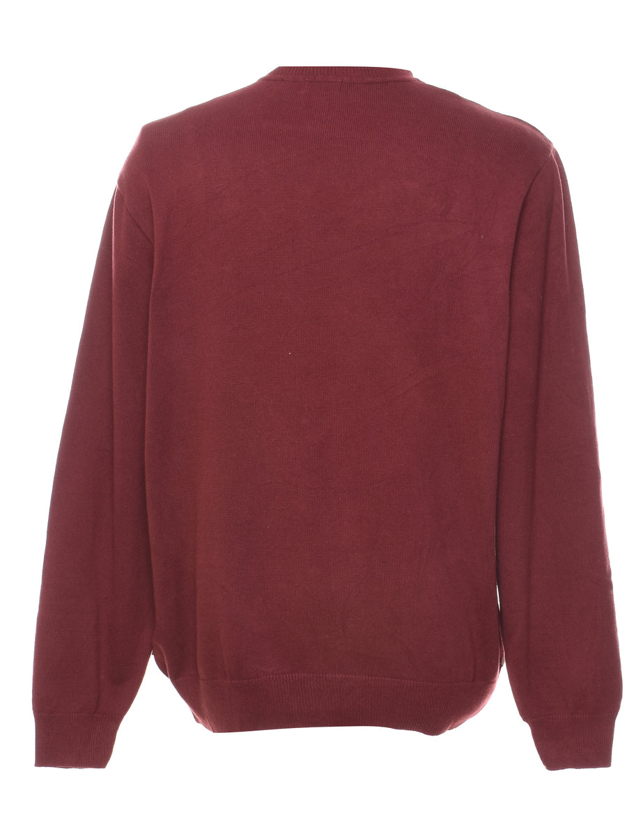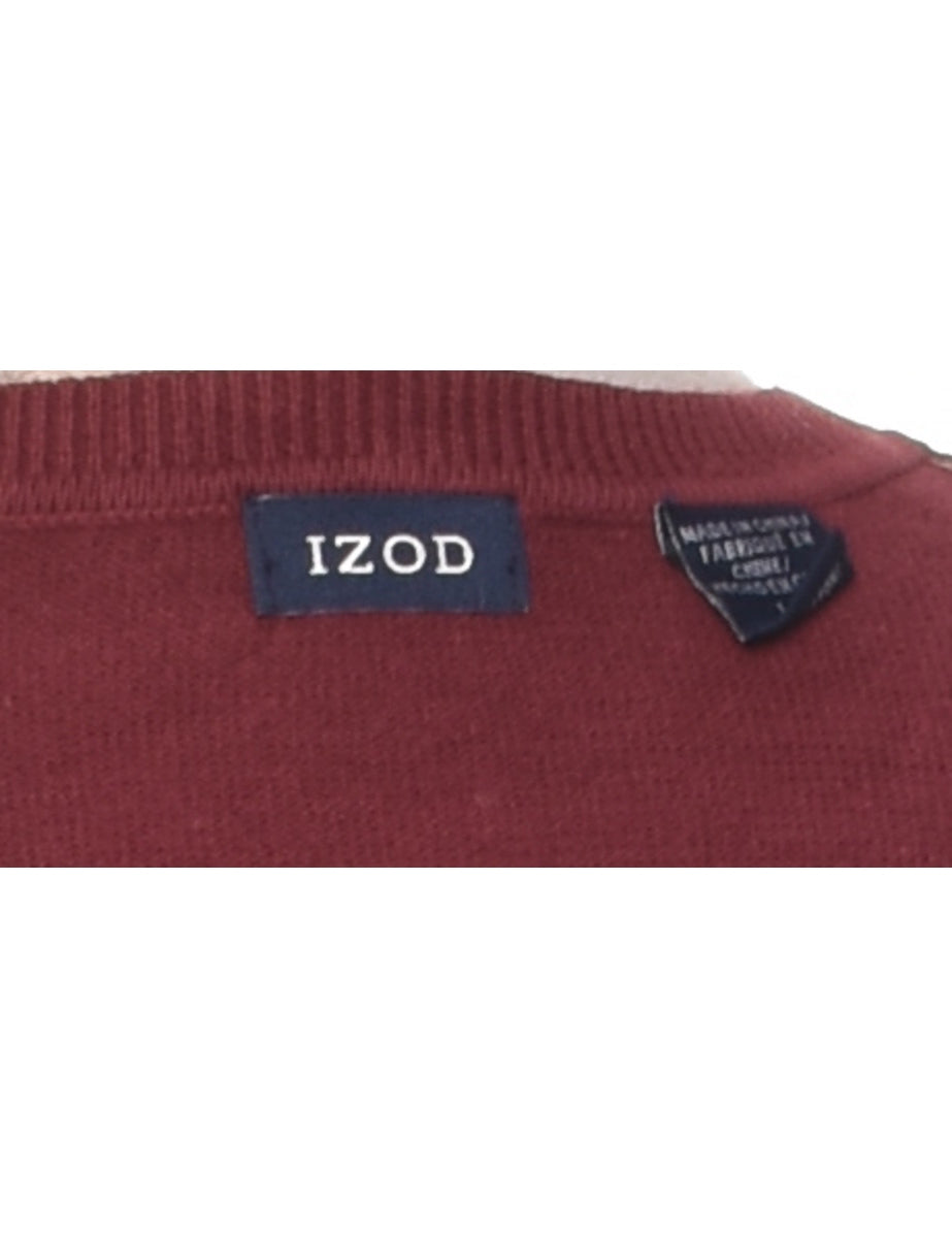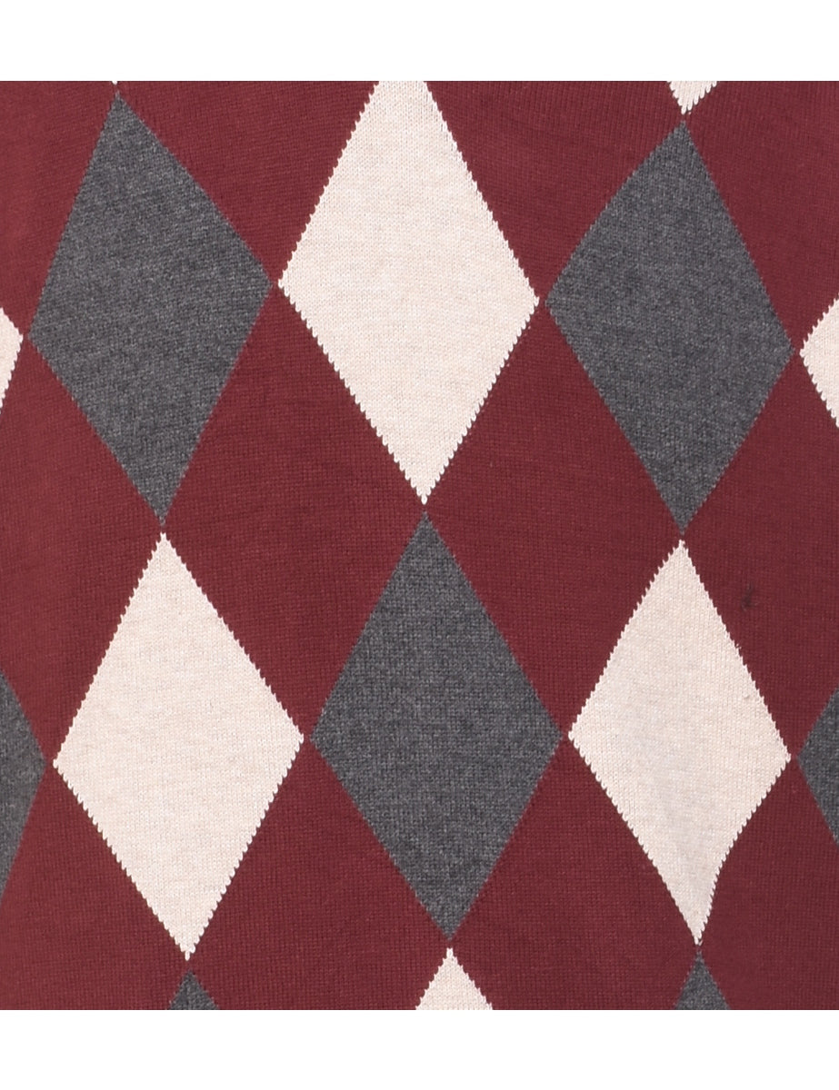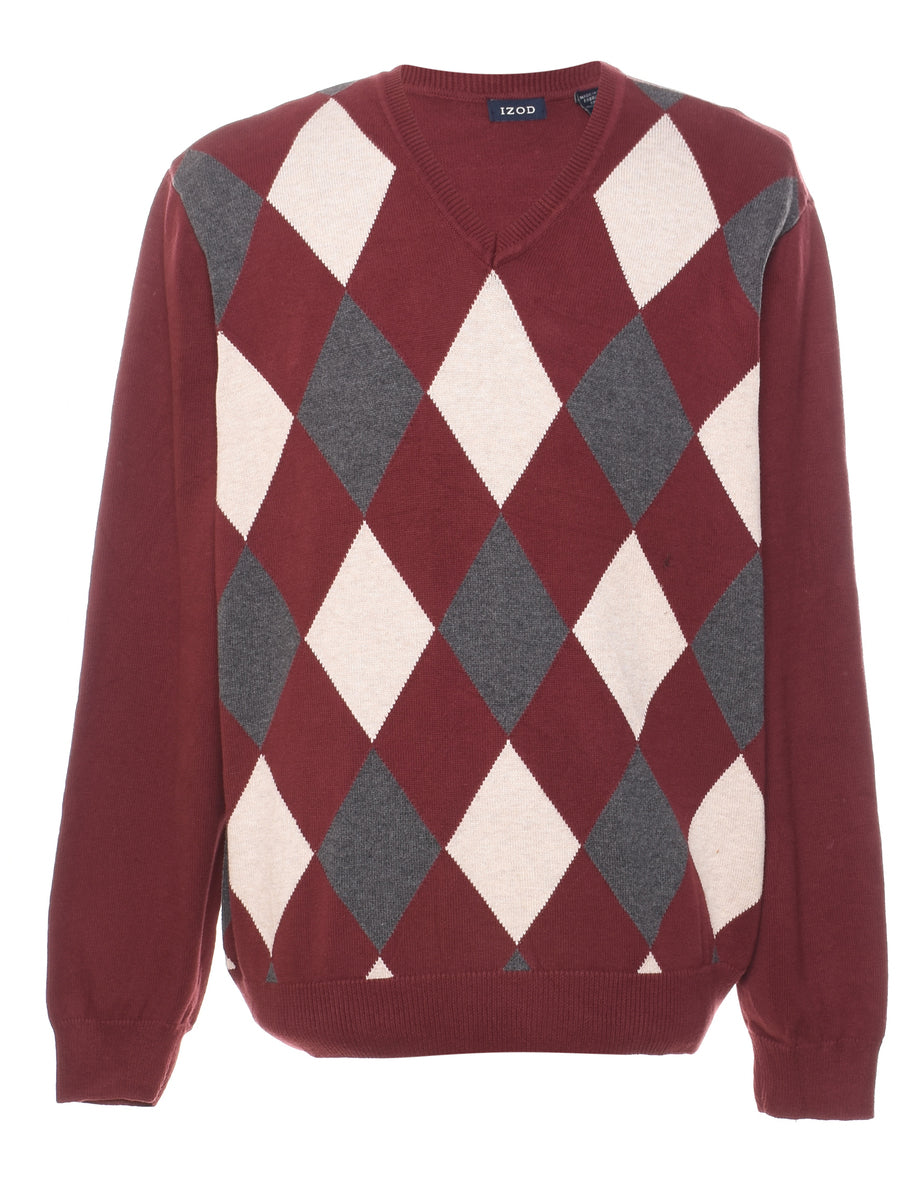 Harlequin pattern jumper in maroon with a v-neck. From the brand Izod.