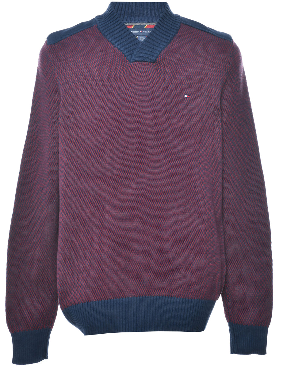 Tommy Hilfiger long sleeved jumper comes in maroon with a v-neck.