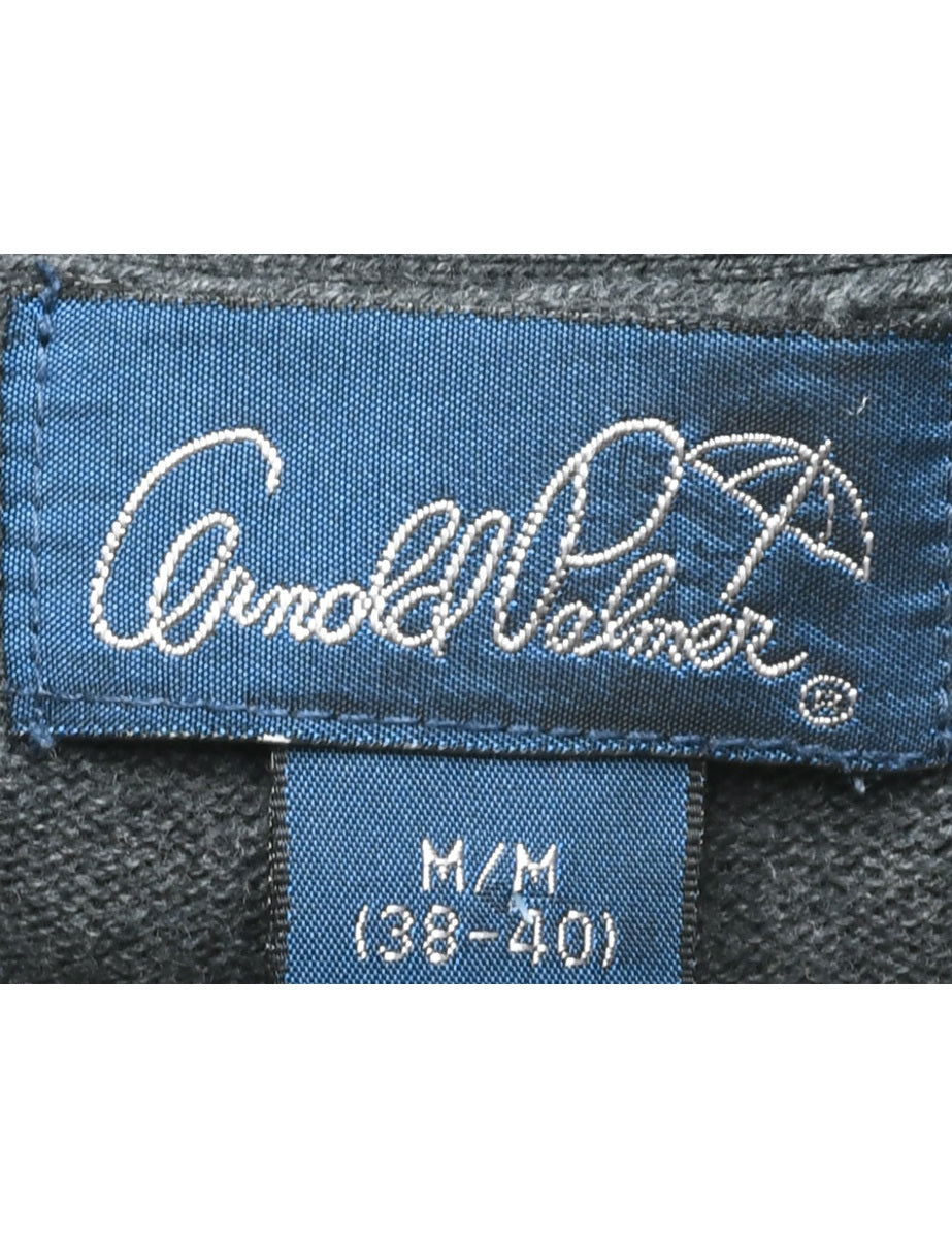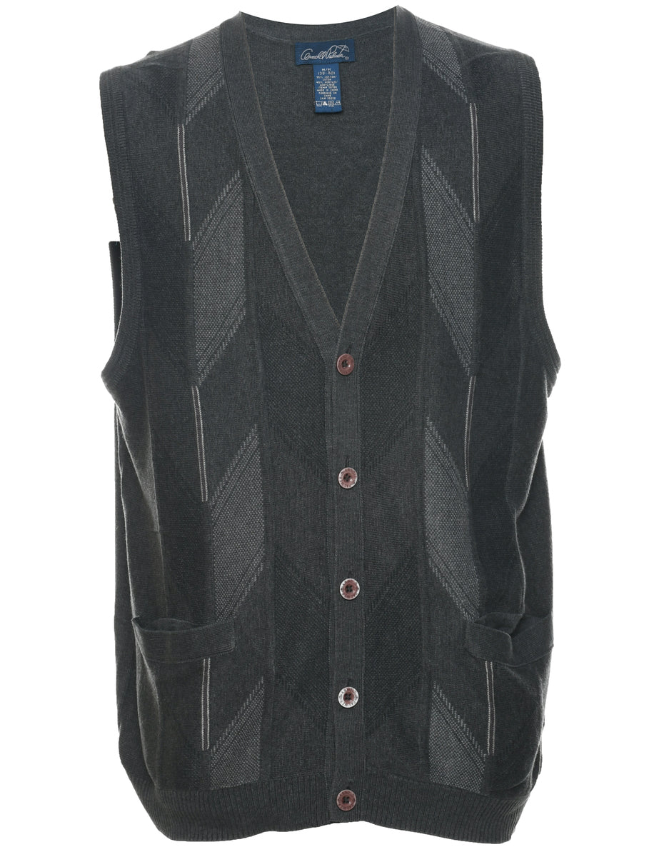 Geometric pattern vest in dark grey with a v-neck and multiple pockets.