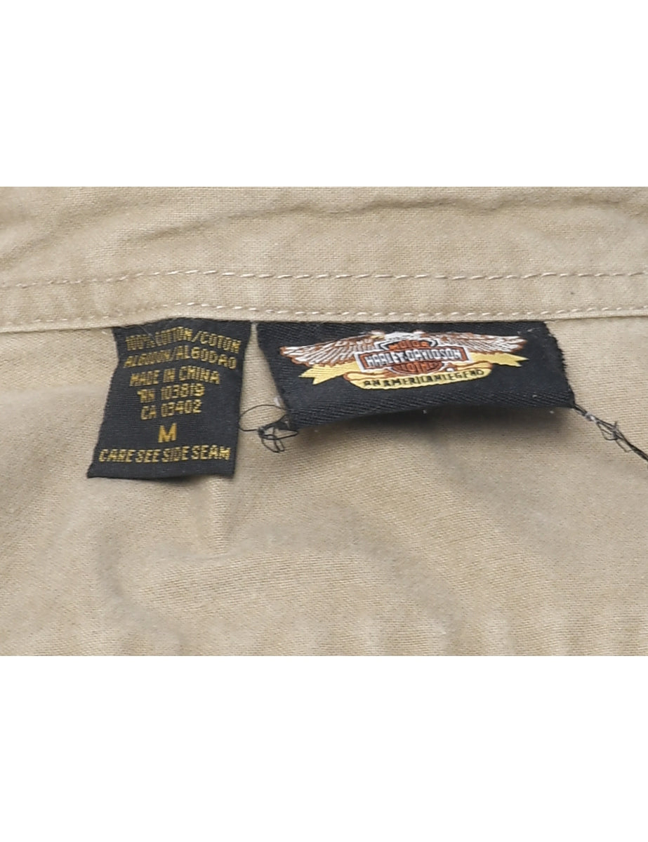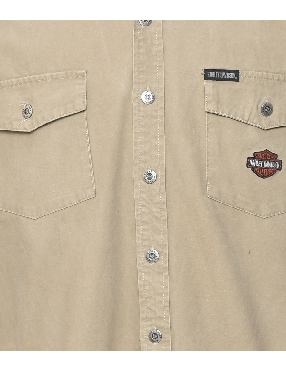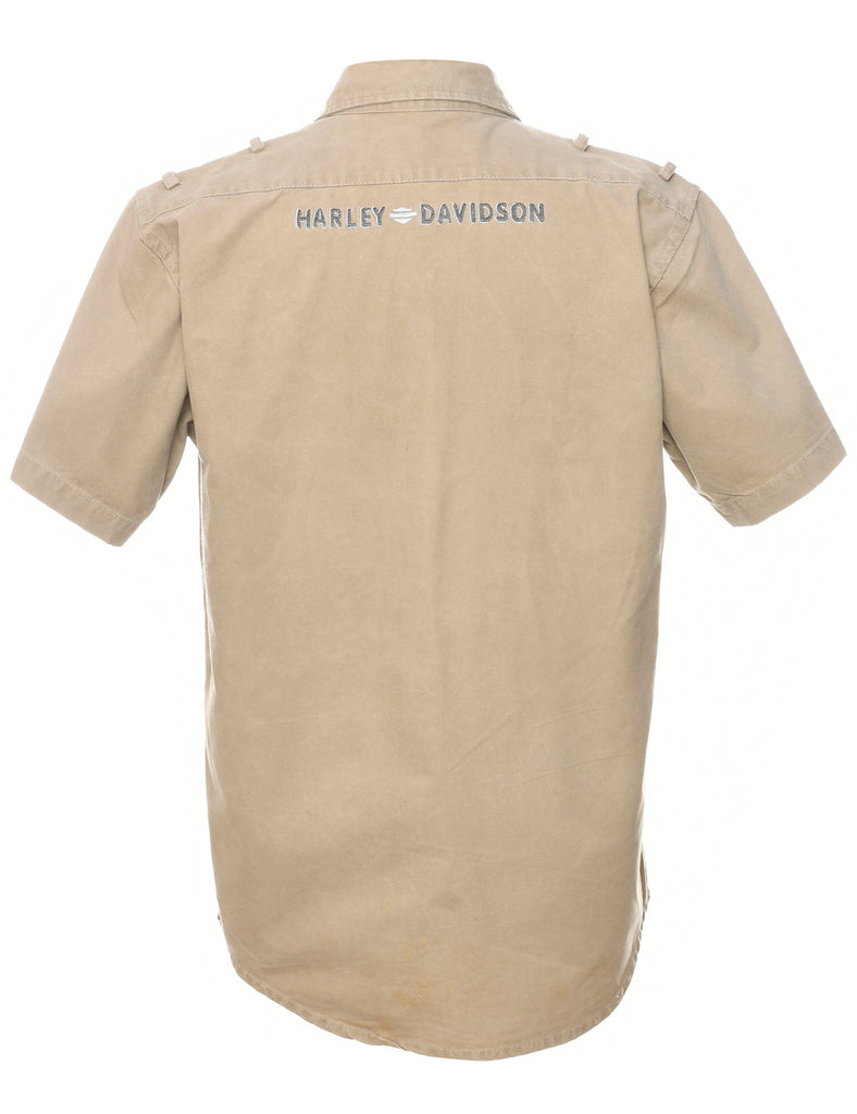 Short sleeve beige Harley Davidson denim shirt with a classic collar and pockets.