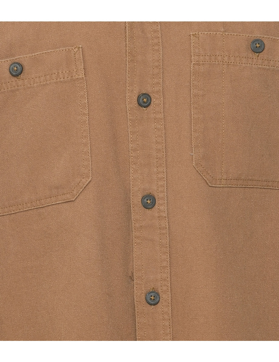 Sleeveless brown workwear denim shirt with a classic collar and pockets.