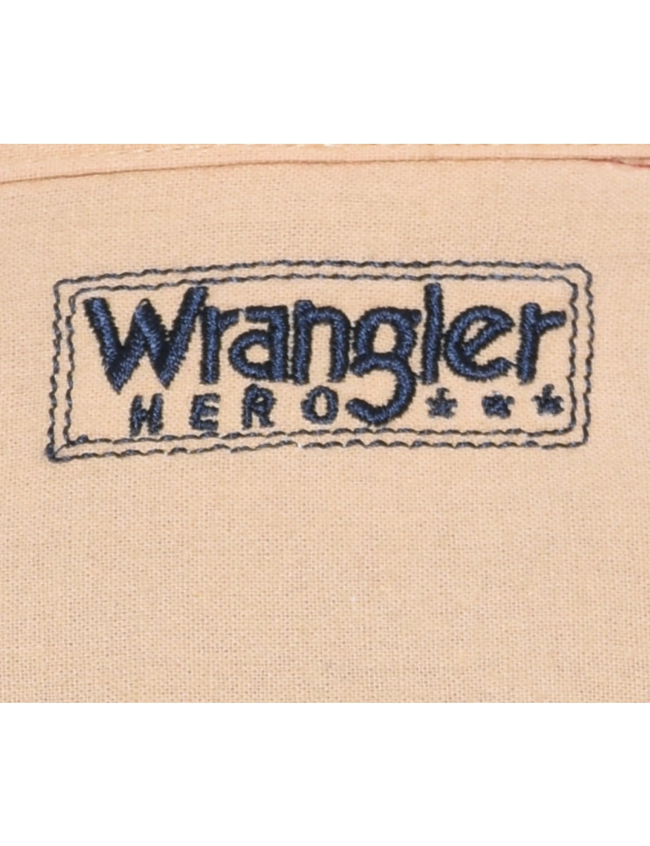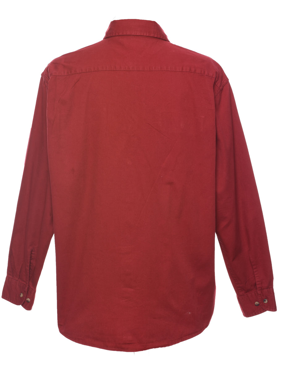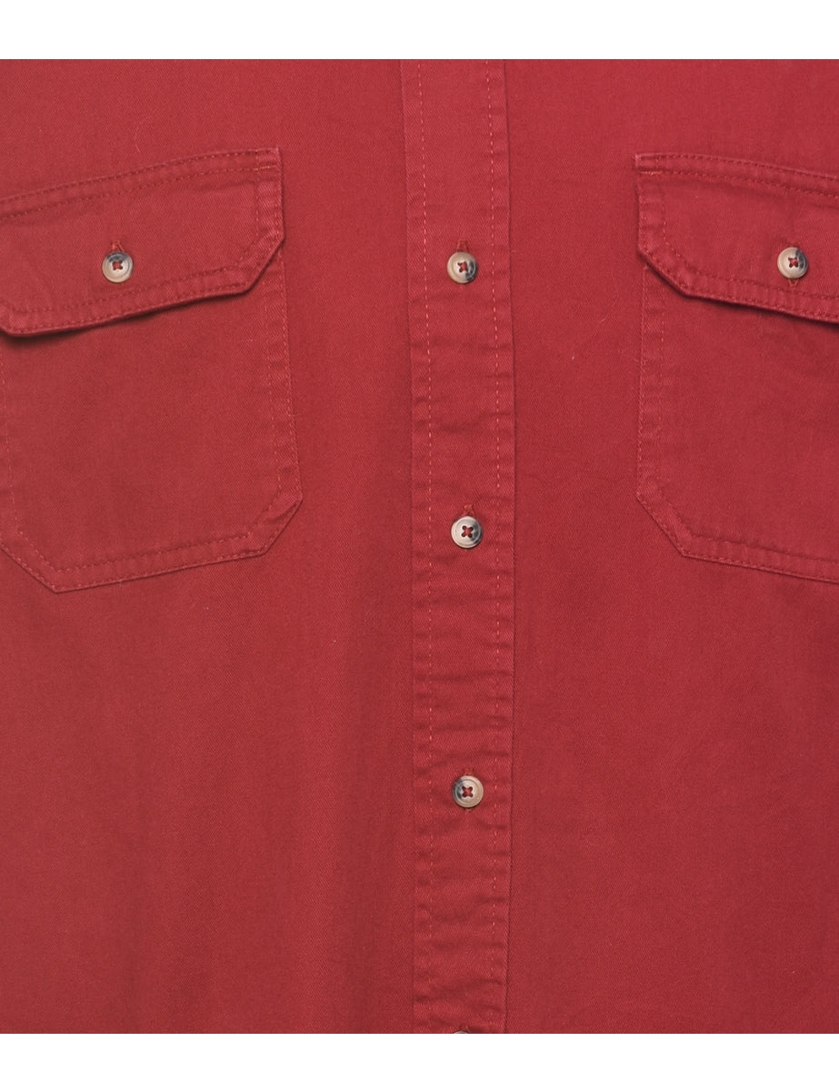 Long sleeved maroon Wrangler denim shirt with pockets.