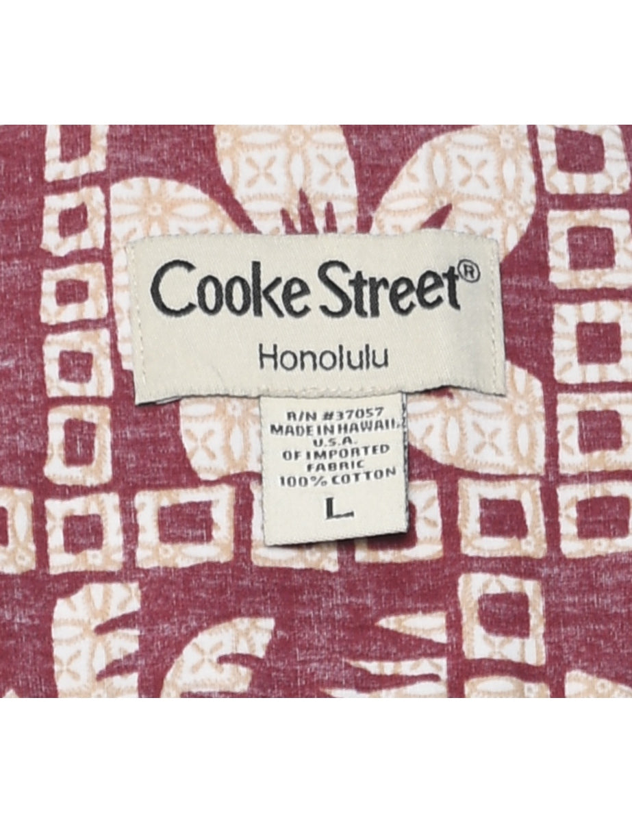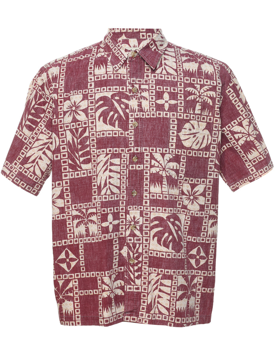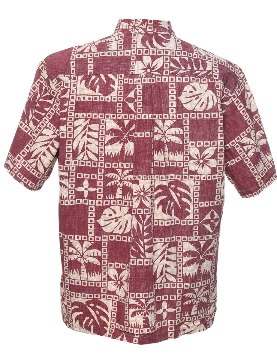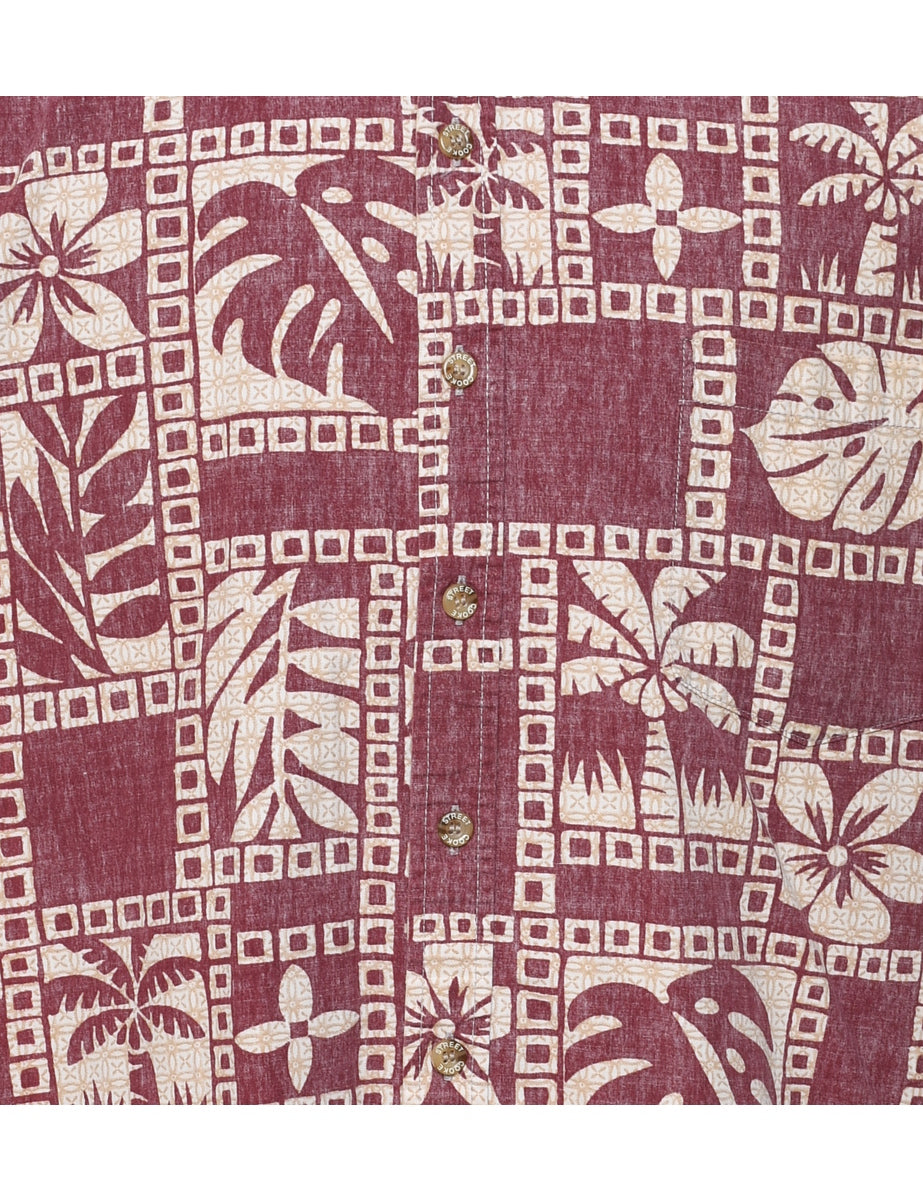 Leafy print hawaiian shirt. Cooke Street in maroon with a classic collar and one pocket.