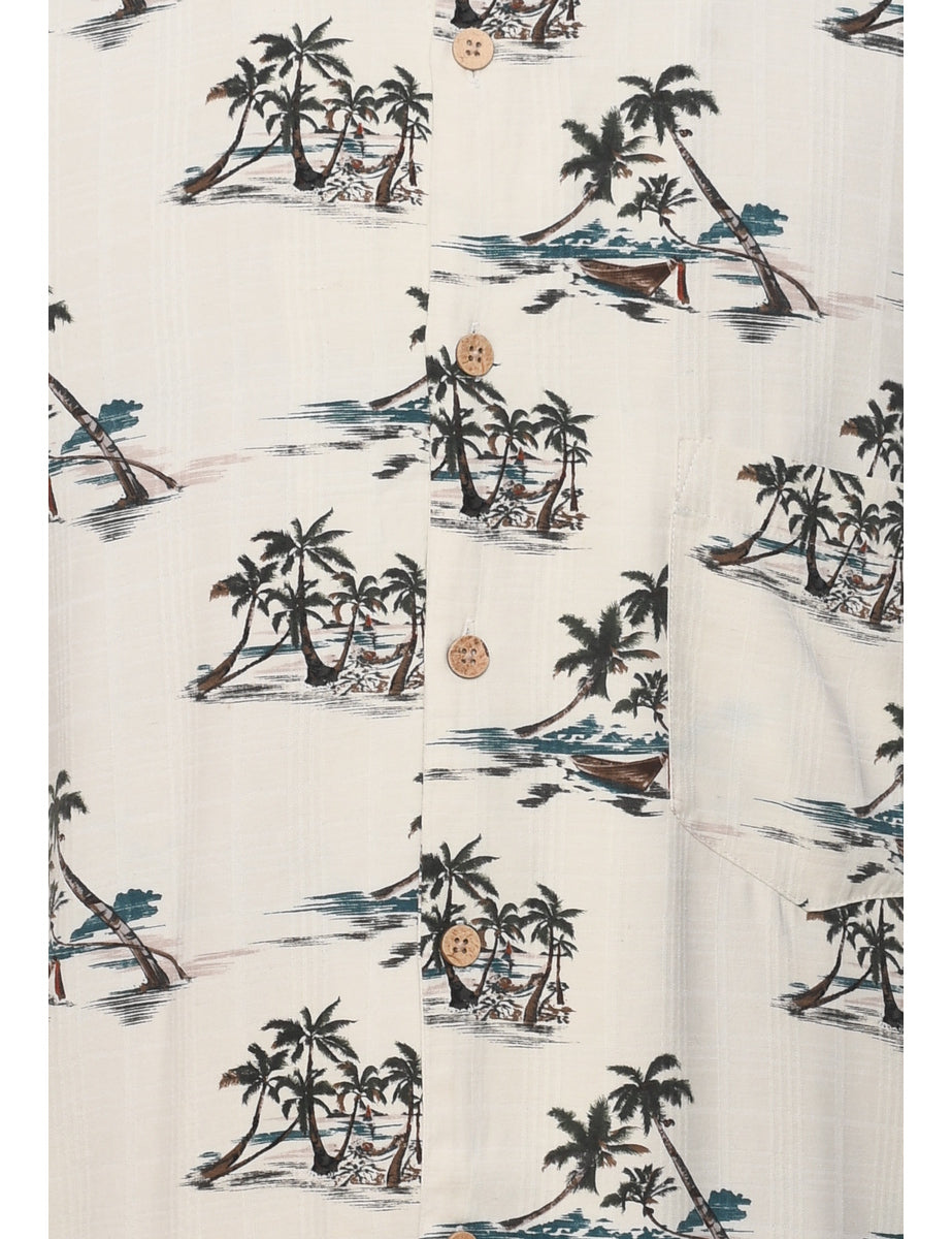 Tropical hawaiian shirt comes in off white with a revere front and one pocket.