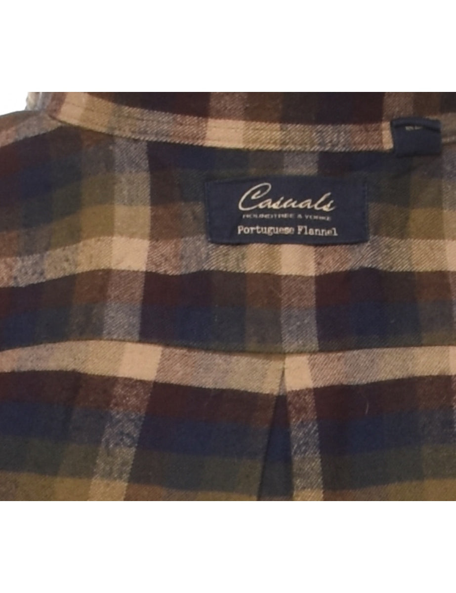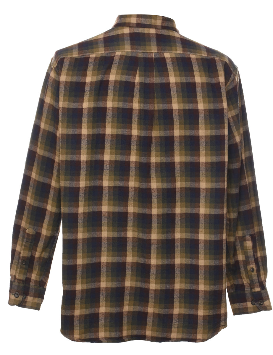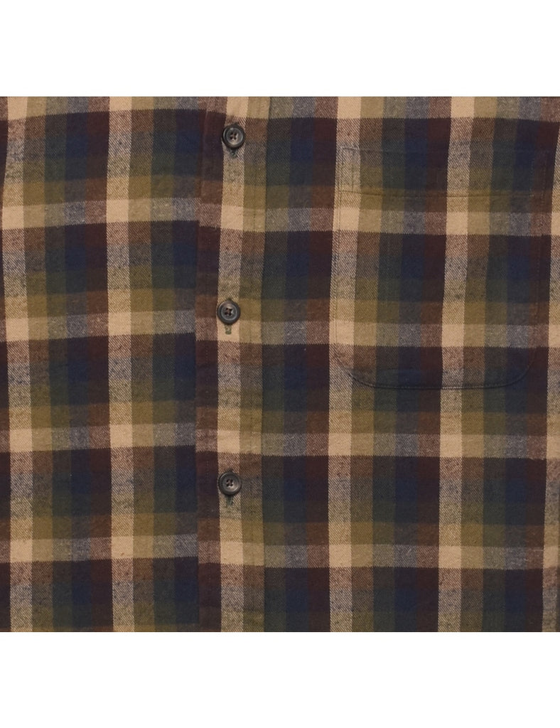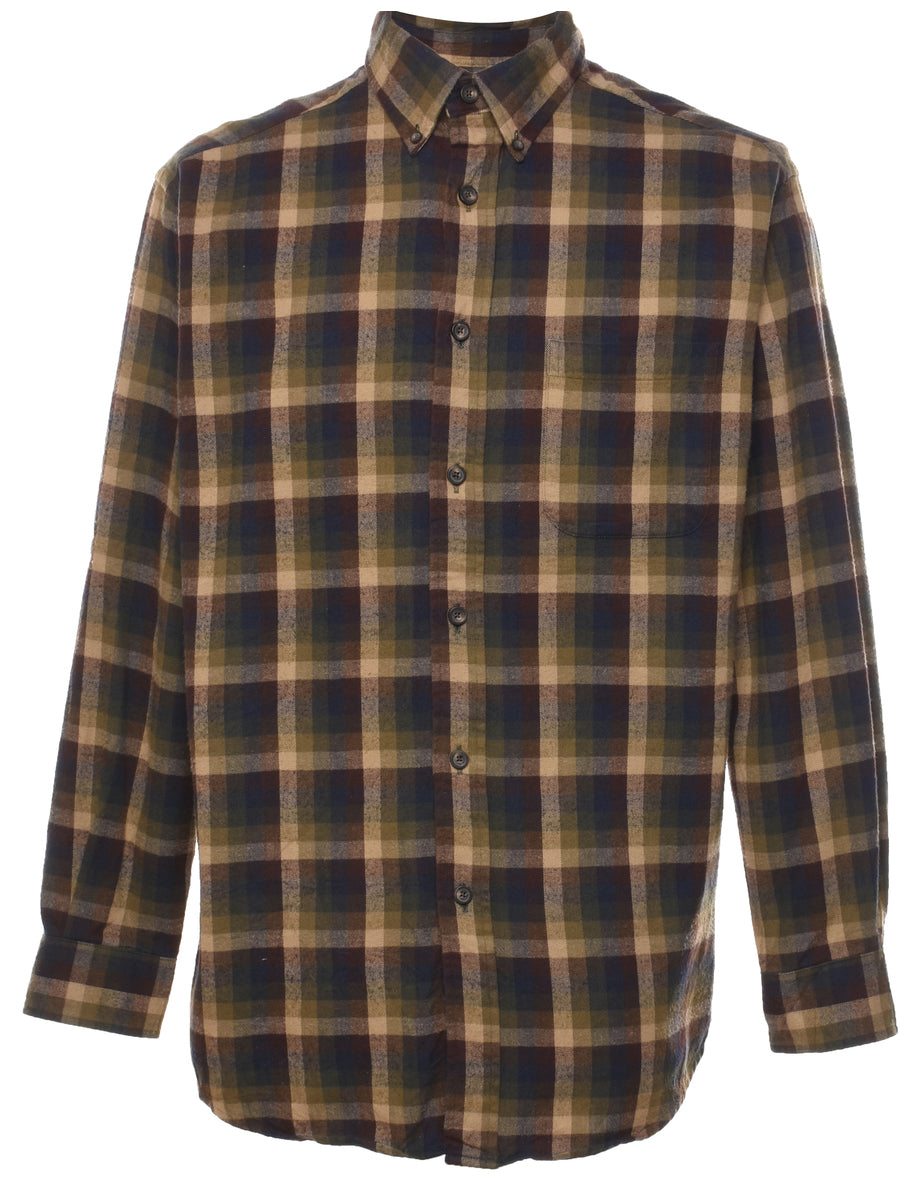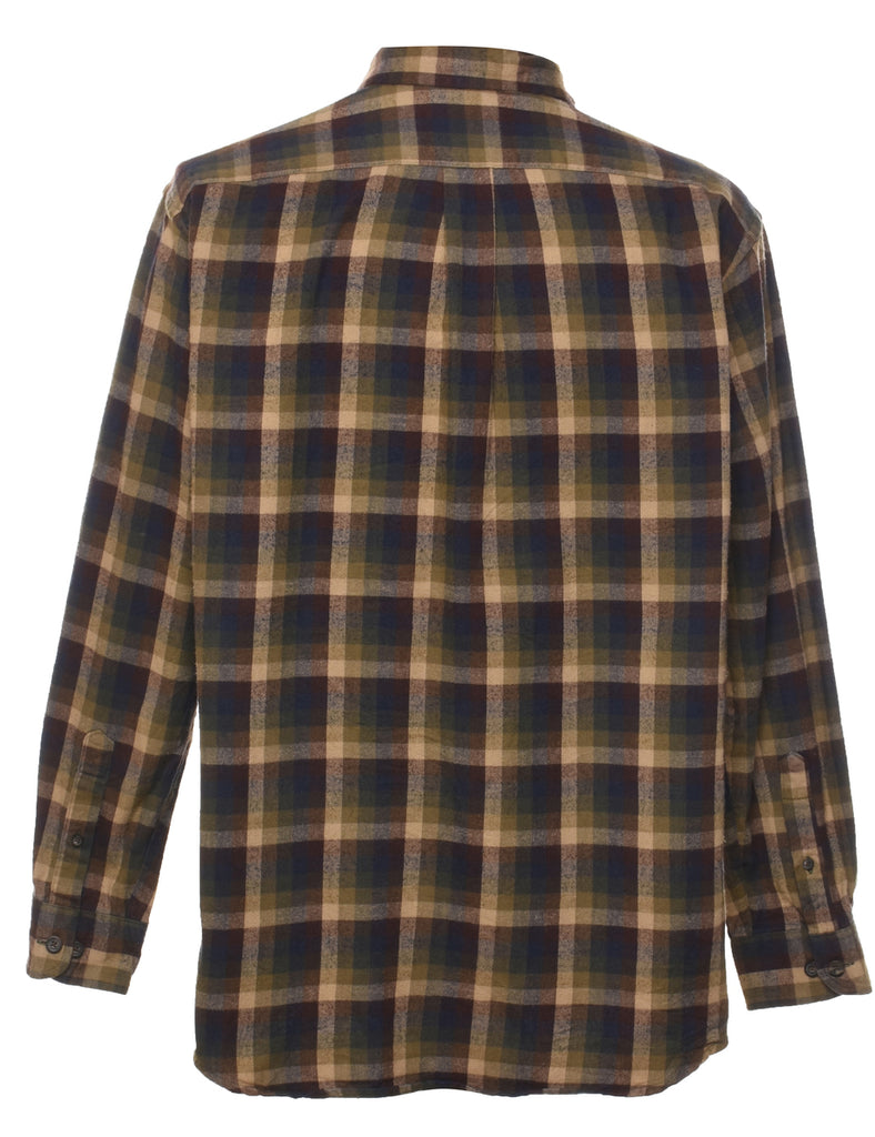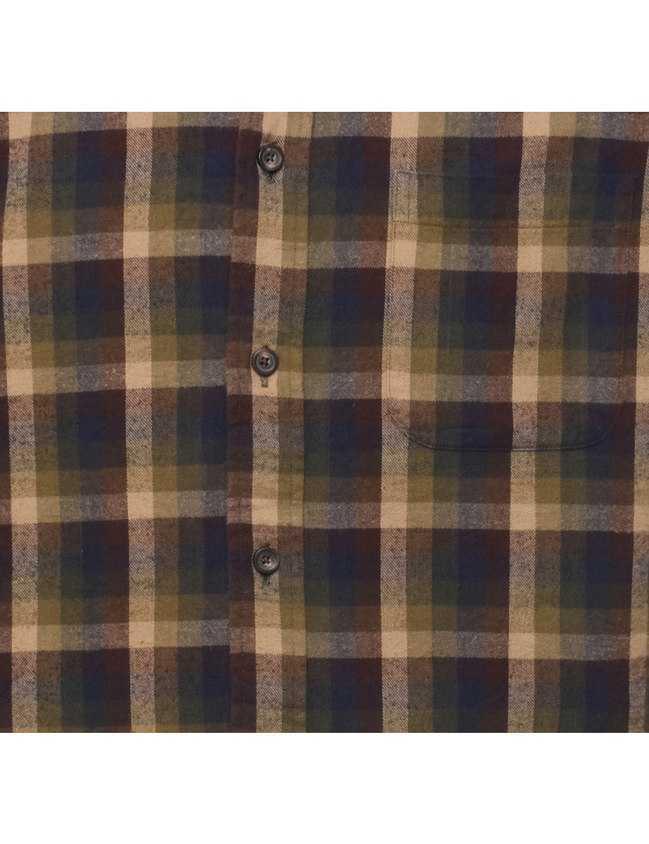 Long sleeved multi-color checked flannel 1990s shirt with one pocket.