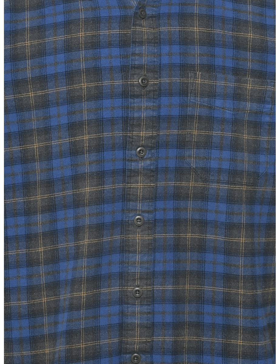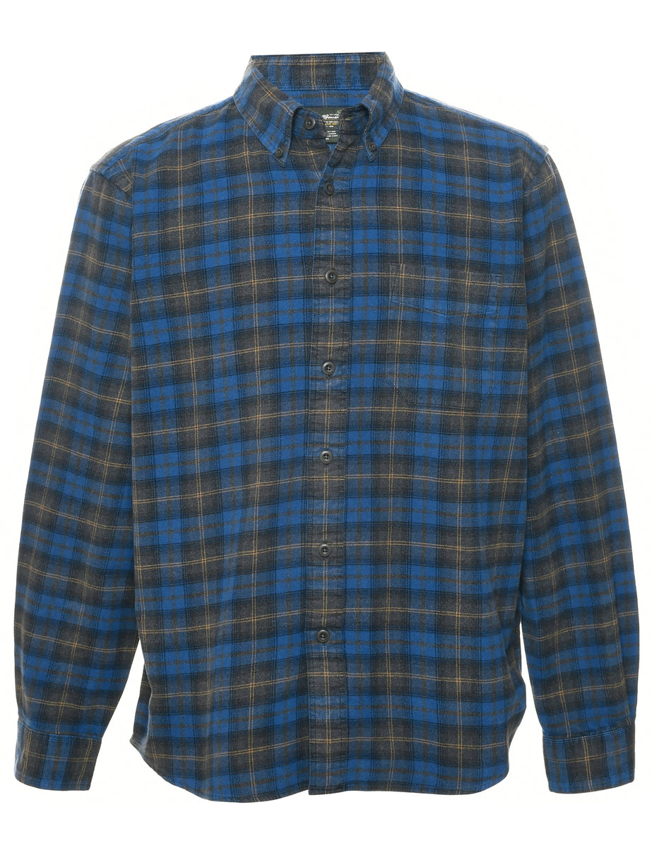 Long sleeved dark grey & blue Eddie Bauer checked shirt with one pocket.