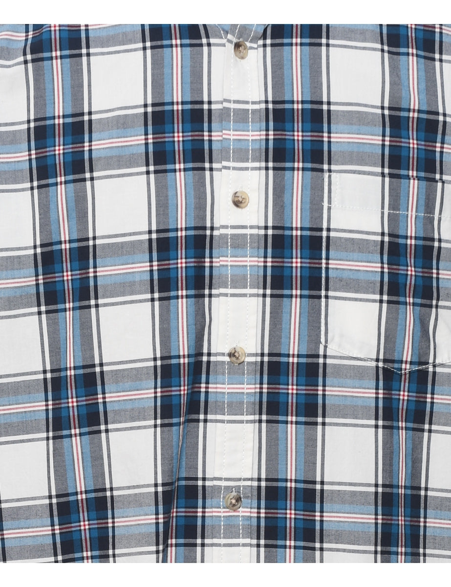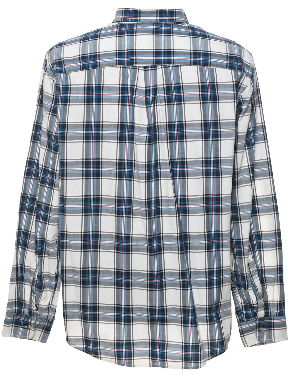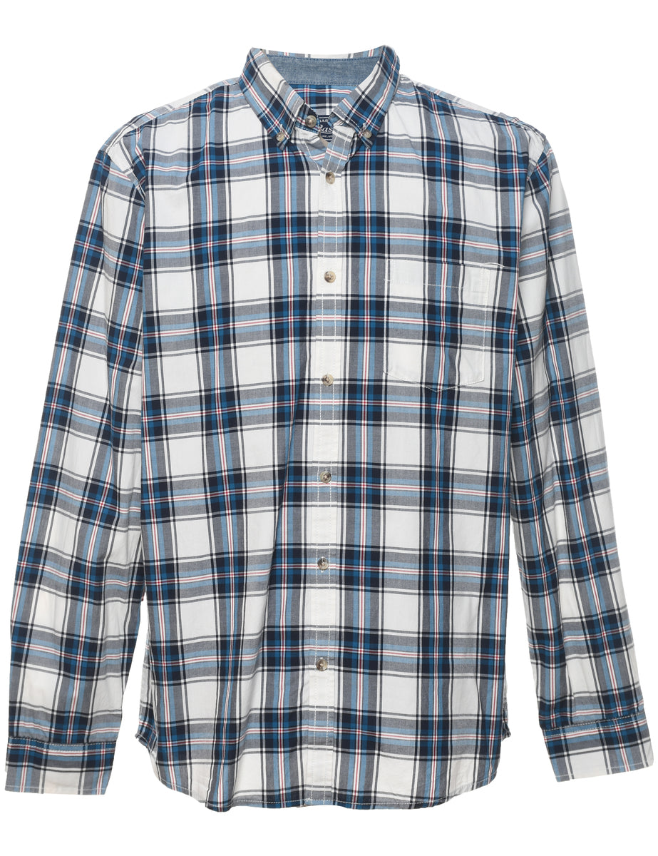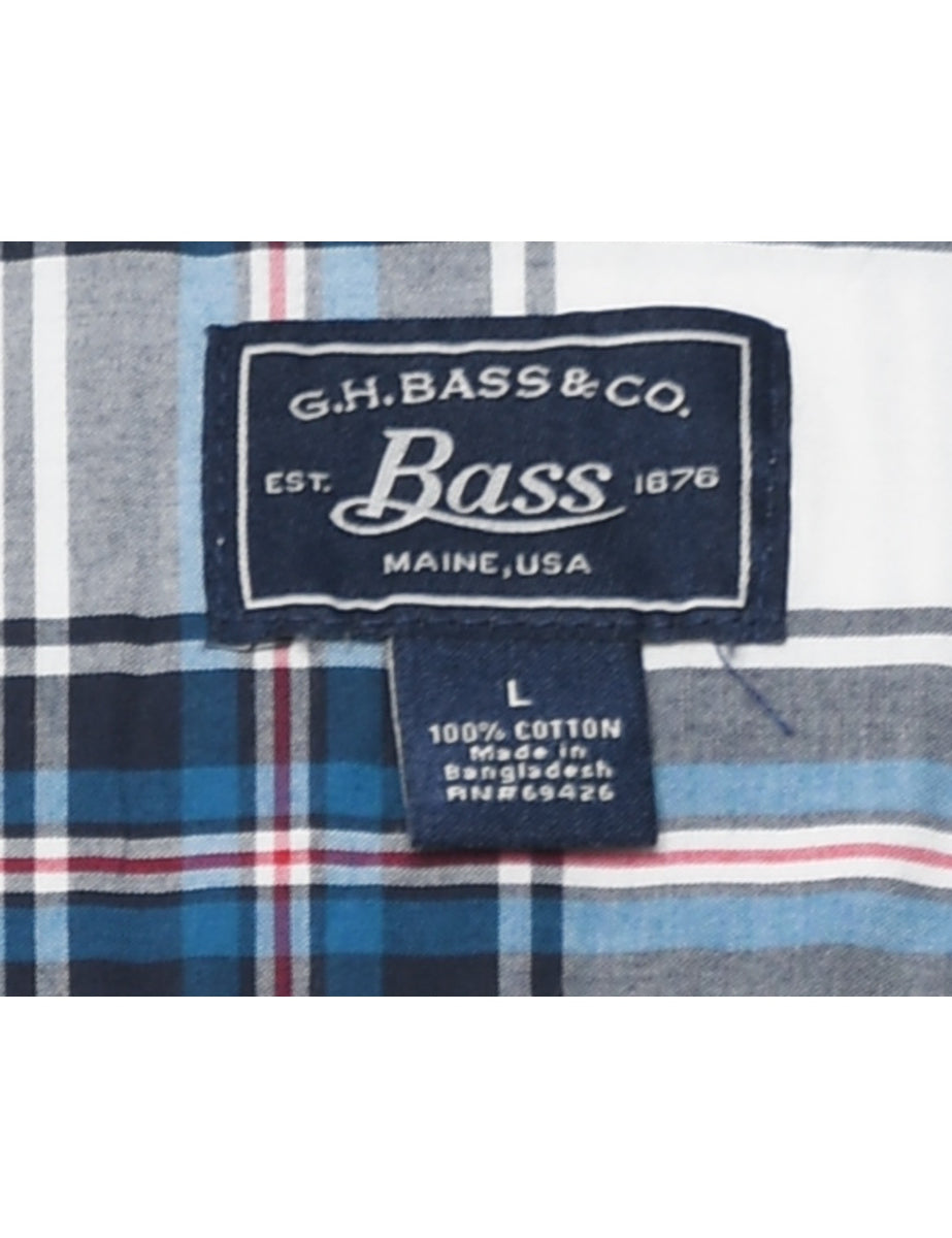 Long sleeved checked shirt. G. H. Bass in white with one pocket.