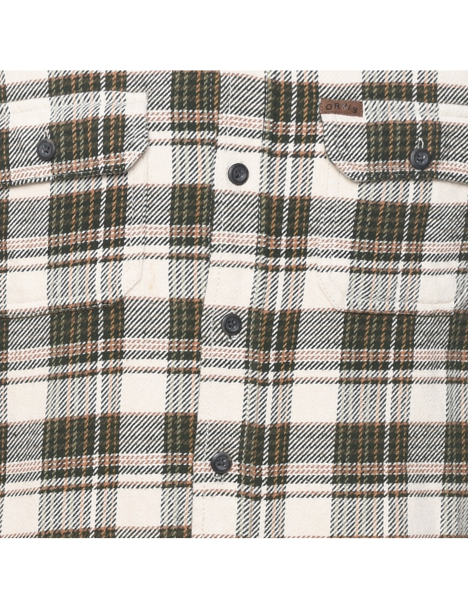 Long-sleeved checked brown & off-white flannel shirt complete with a classic collar and pockets.