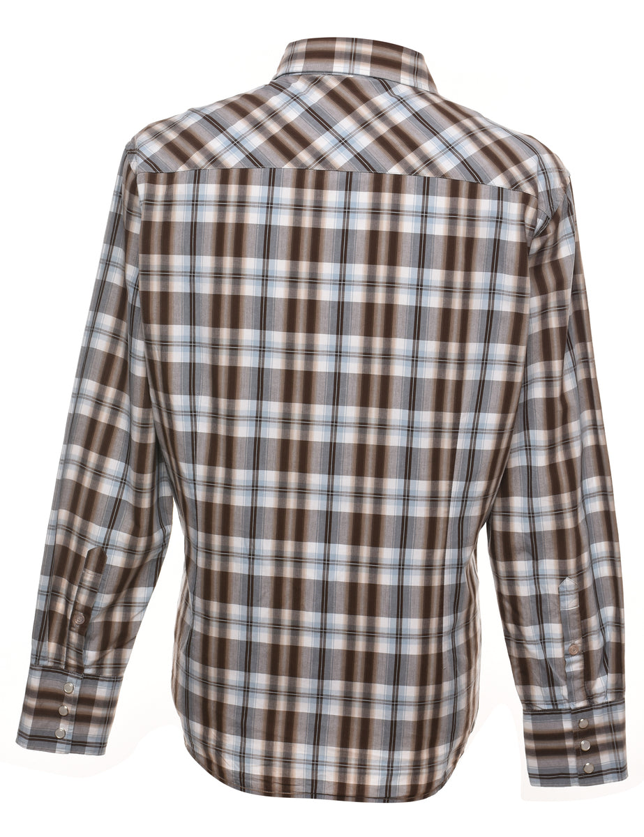 Long-sleeved light blue & brown western design checked shirt complete with a classic collar.