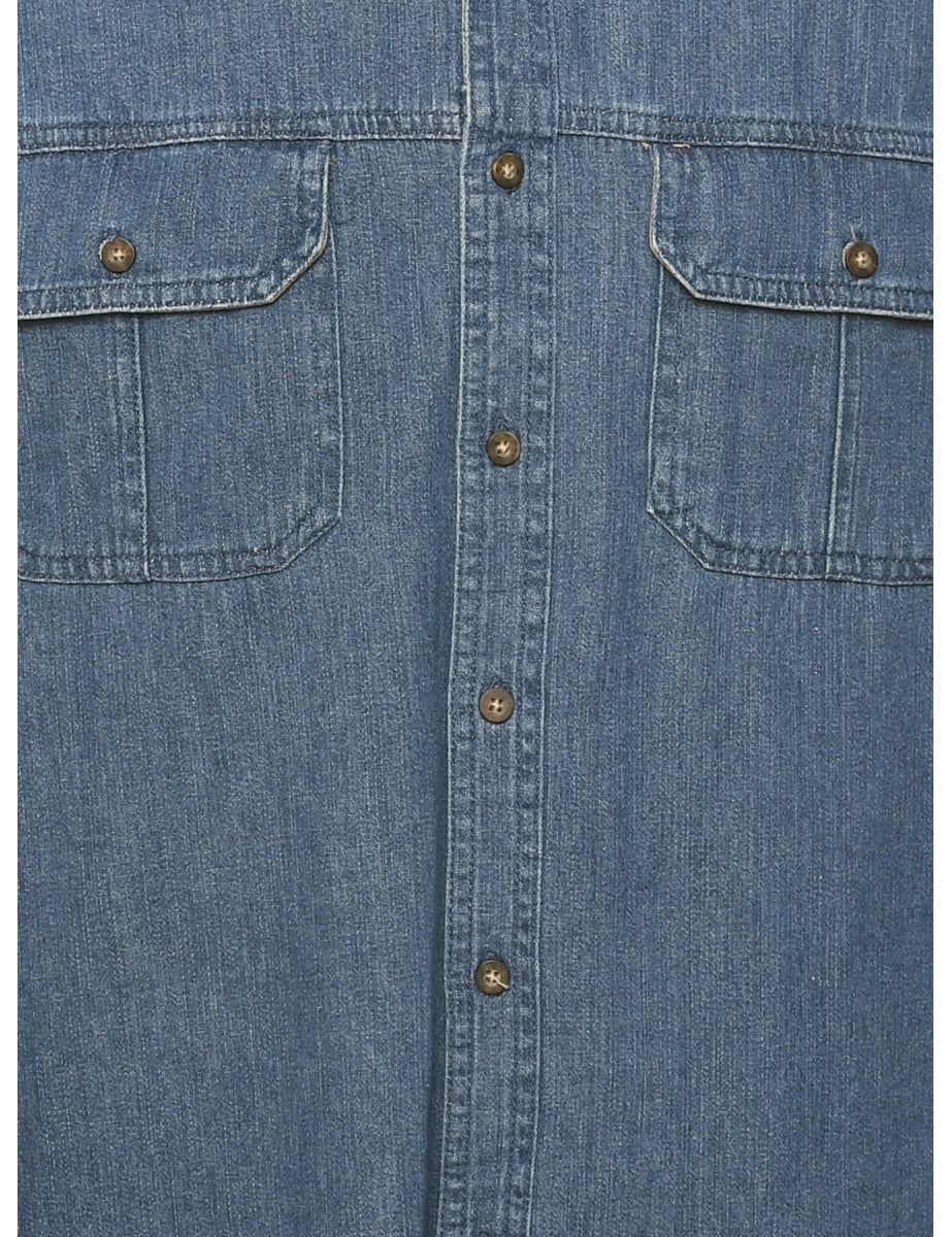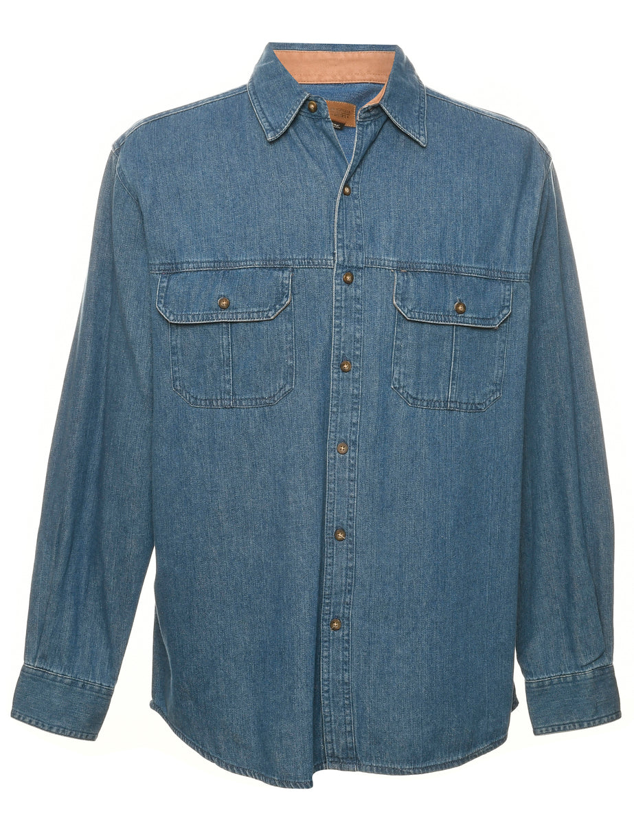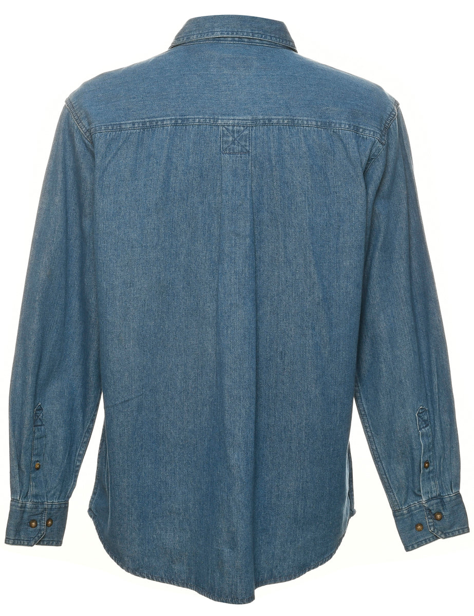Long sleeved denim shirt comes in medium wash with a classic collar and pockets.