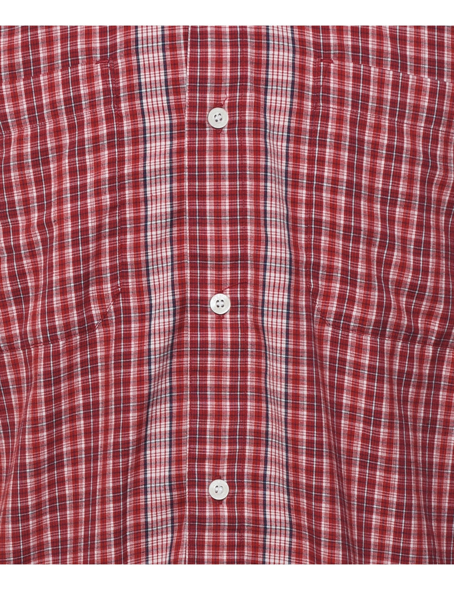 Short sleeve checked shirt comes in red with a classic collar and pockets.