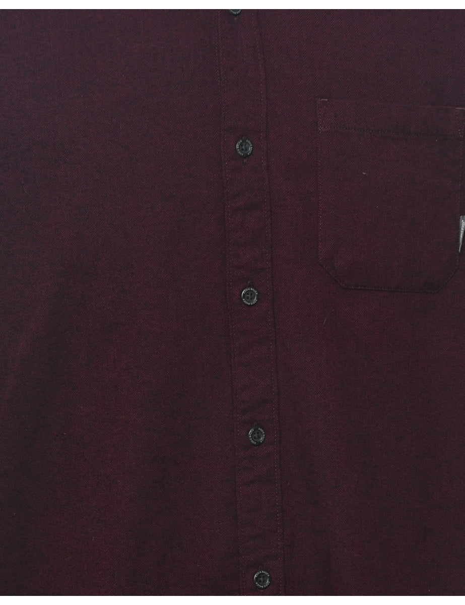Long sleeved plum Eddie Bauer flannel shirt with one pocket.