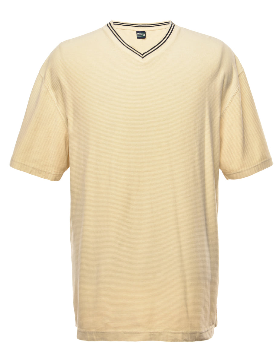 Extra long plain t-shirt. Comes in beige with a v-neck.