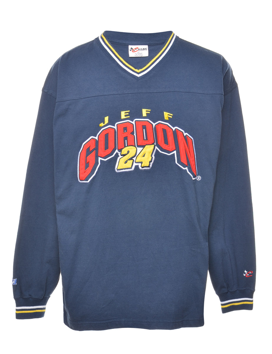 Jeff Gordon printed sweatshirt. Comes in navy with a v-neck.