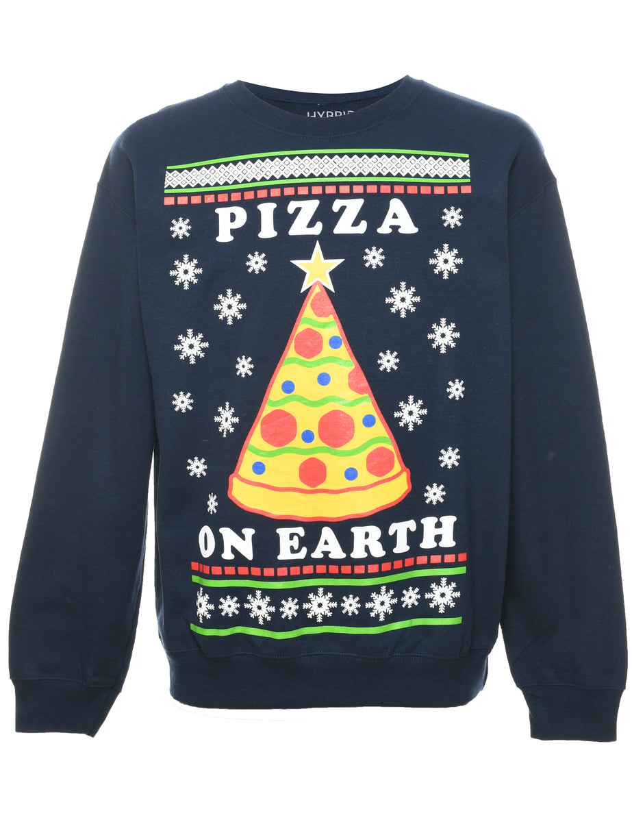 Festive season navy pizza on earth christmas sweatshirt with a drop shoulder.