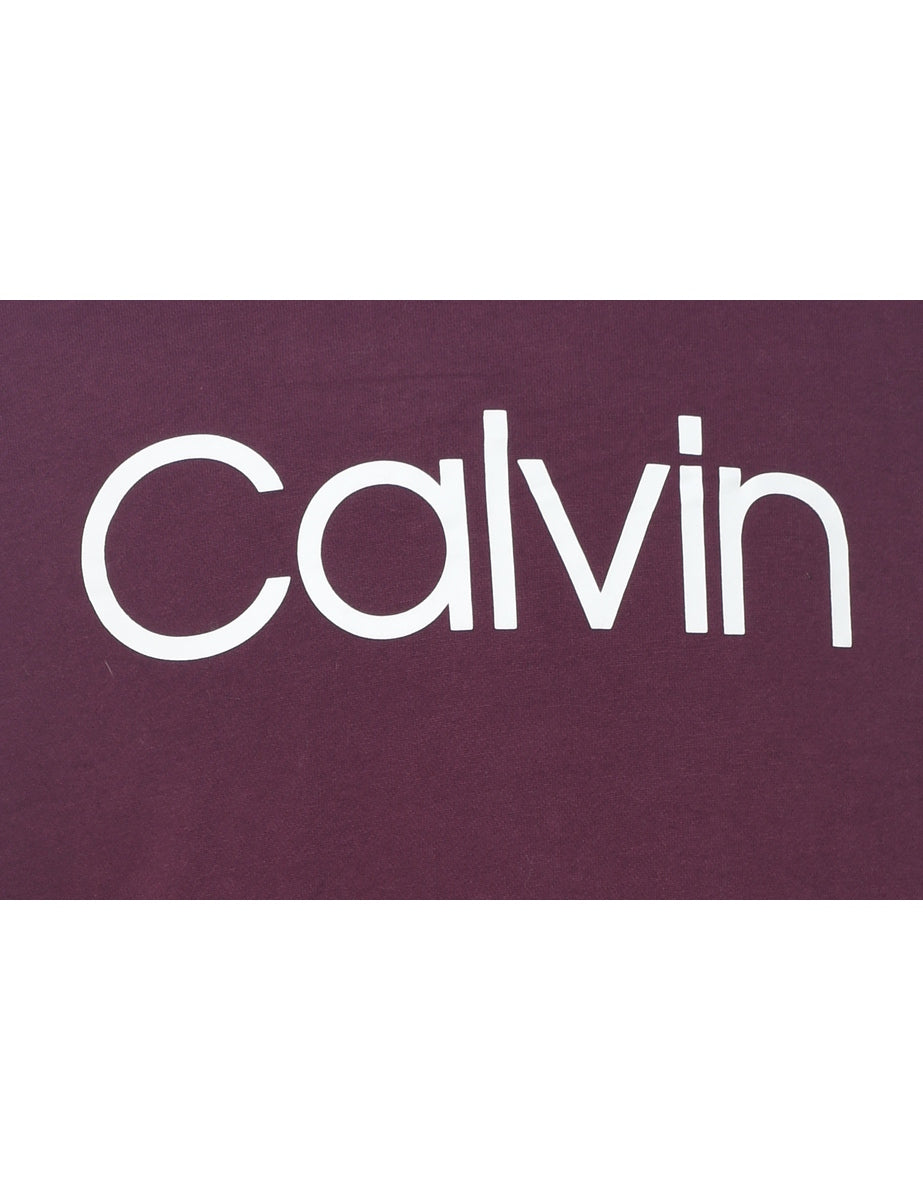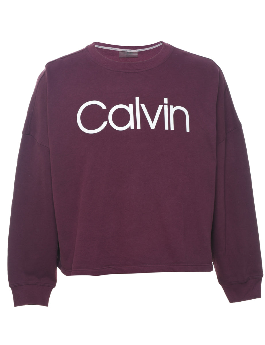 Calvin Klein cropped printed sweatshirt in plum with a drop shoulder.