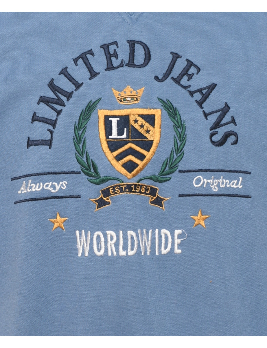 Limited jeans embroidered sweatshirt in white & blue with a drop shoulder.