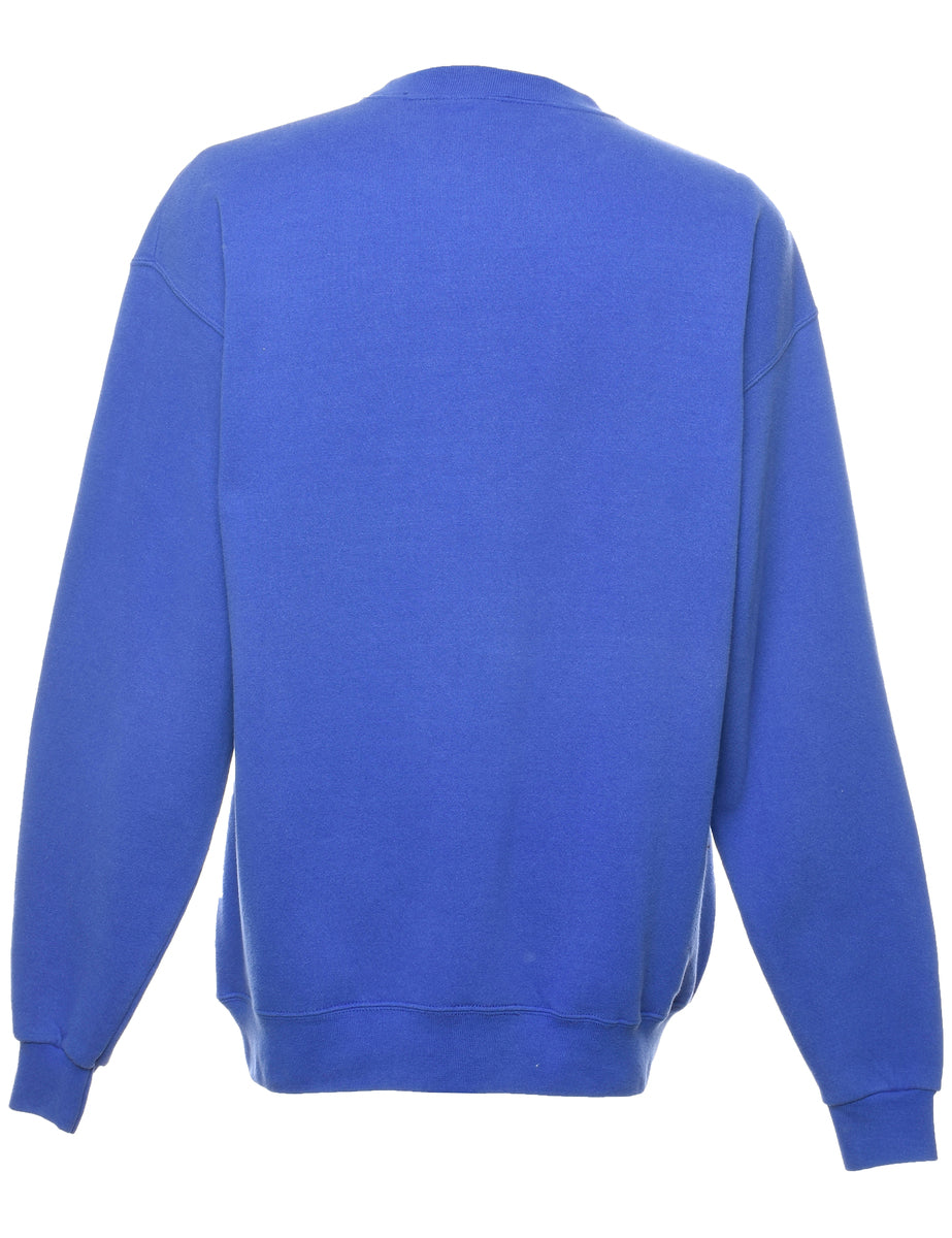Cartoon sweatshirt comes in blue with a drop shoulder.