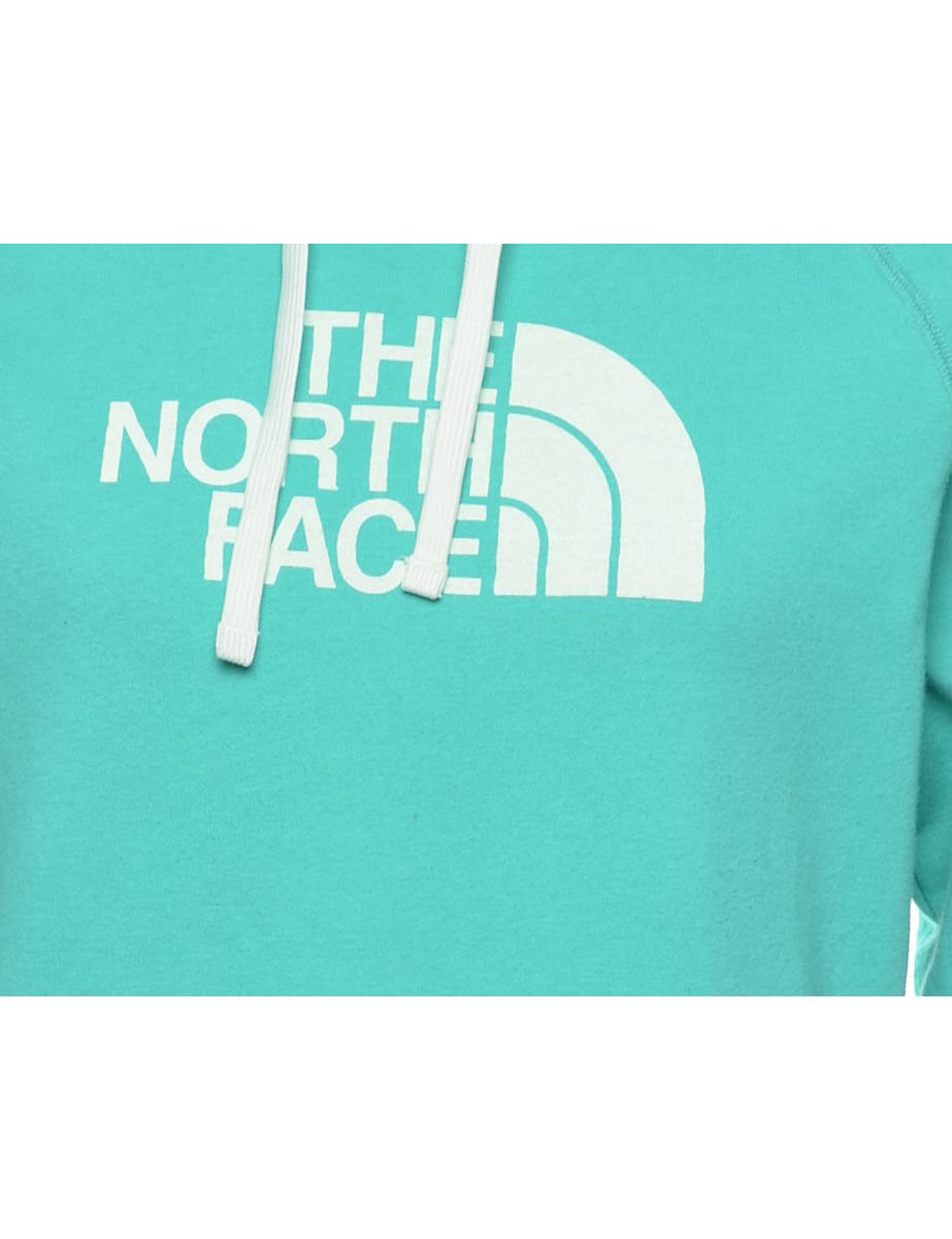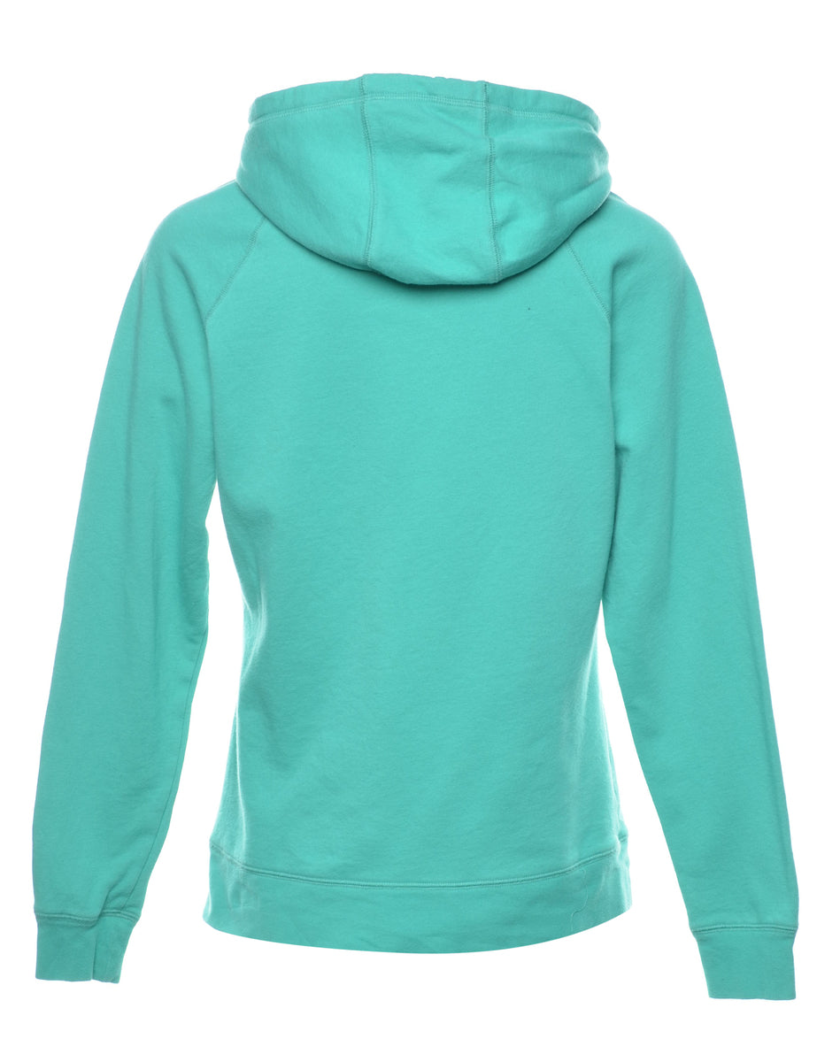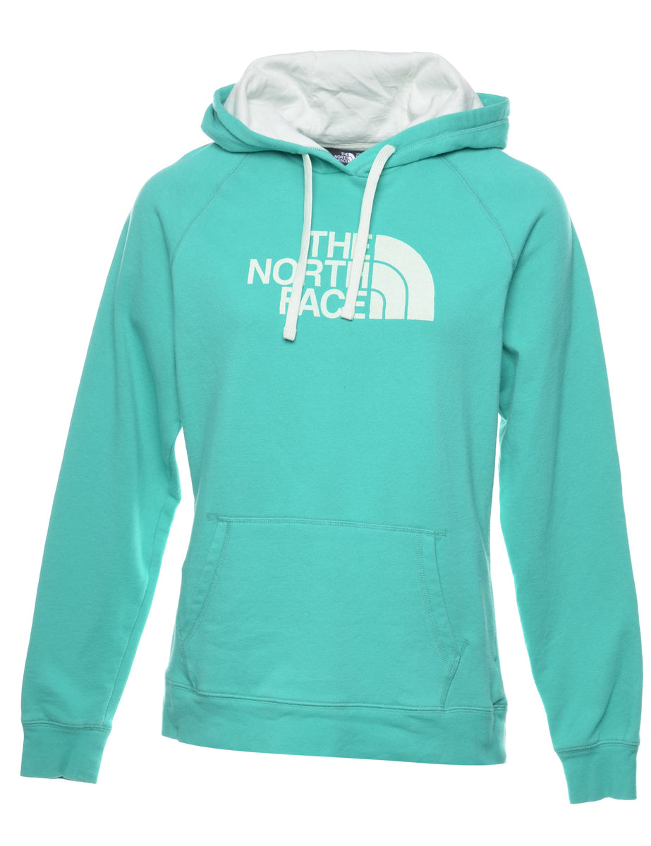 The North Face beaded hoodie in turquoise with one pocket and raglan sleeves.