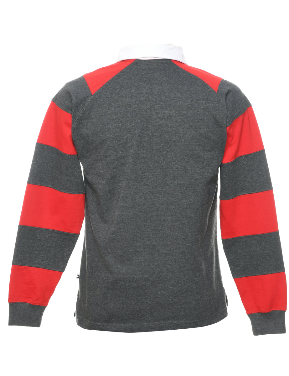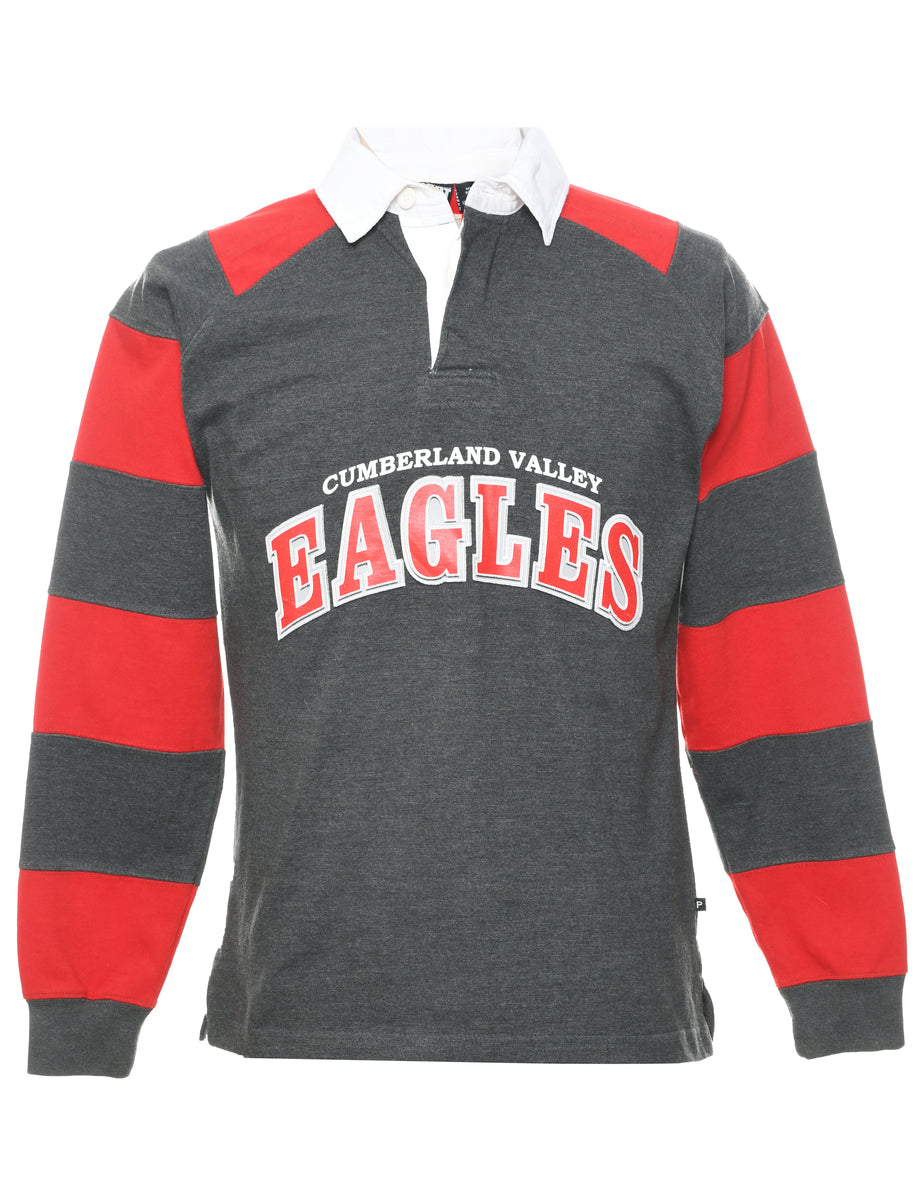 Button front rugby shirt comes in dark grey with raglan sleeves.