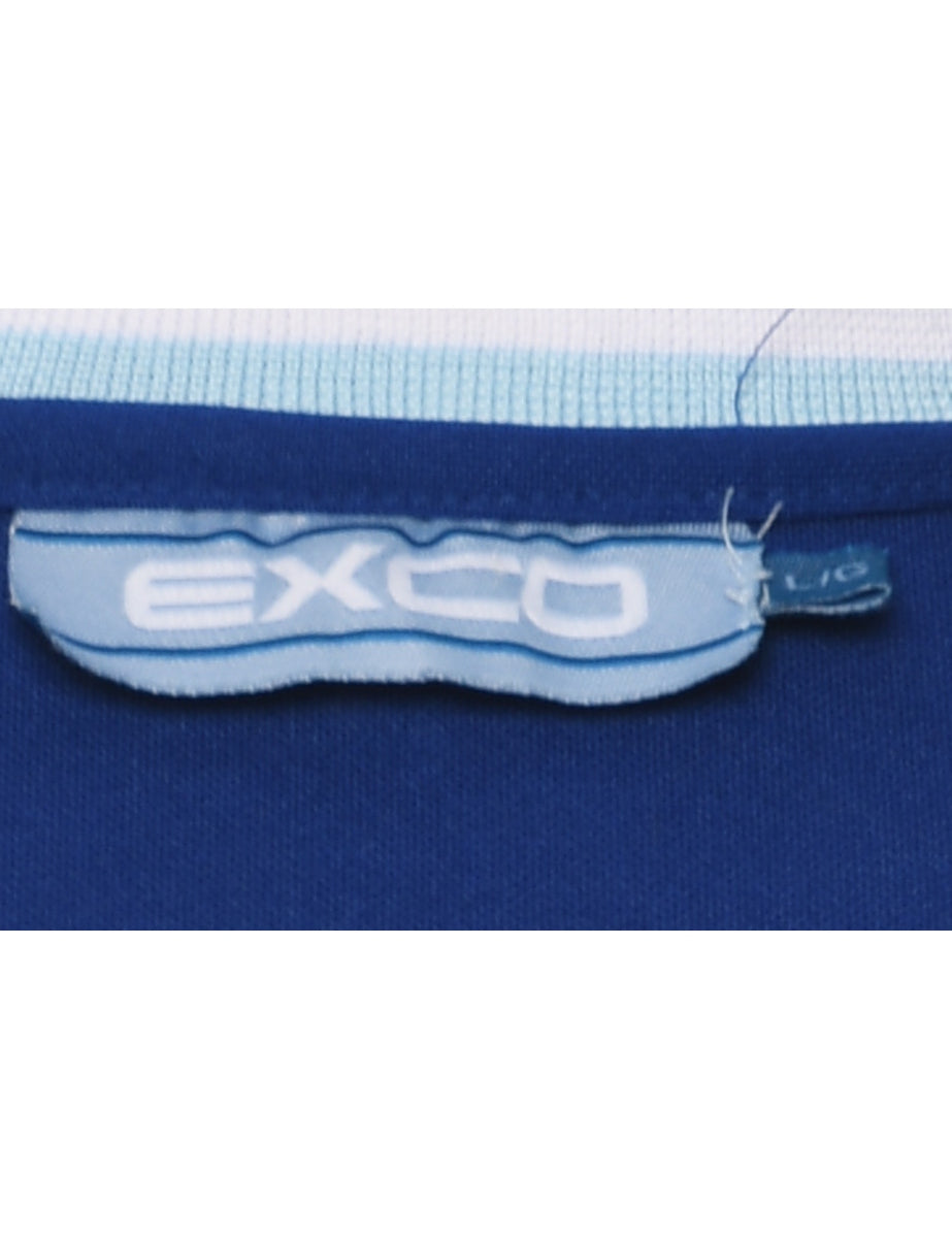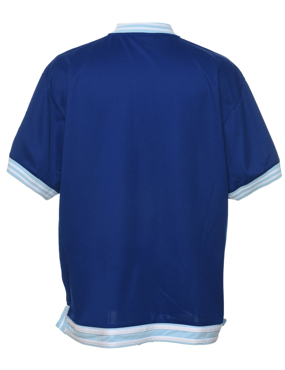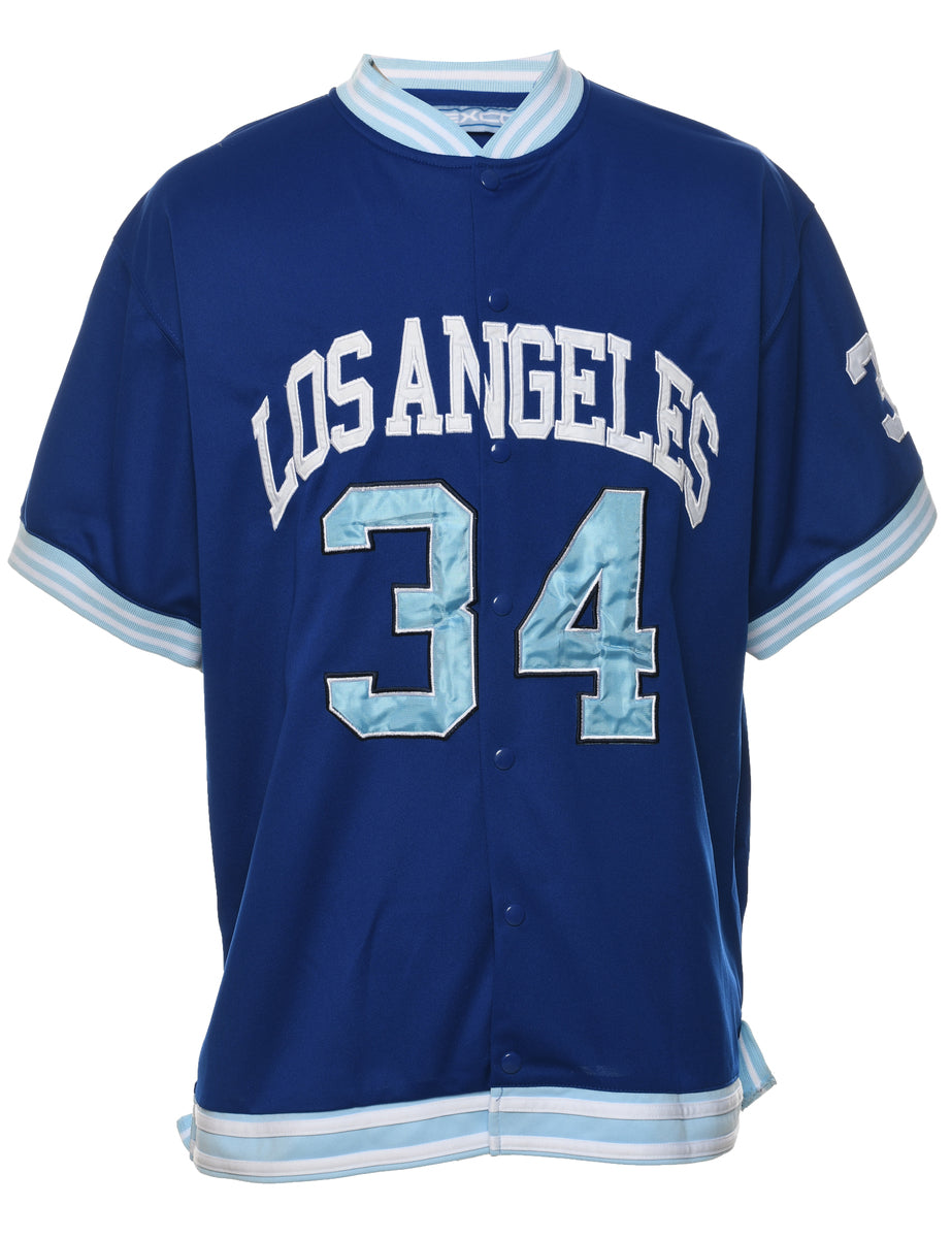 Button front los angeles printed t-shirt comes in blue with contrasting trim.