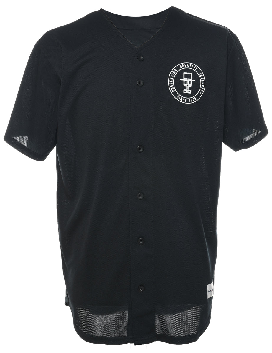 Button front printed t-shirt in black with a v-neck.