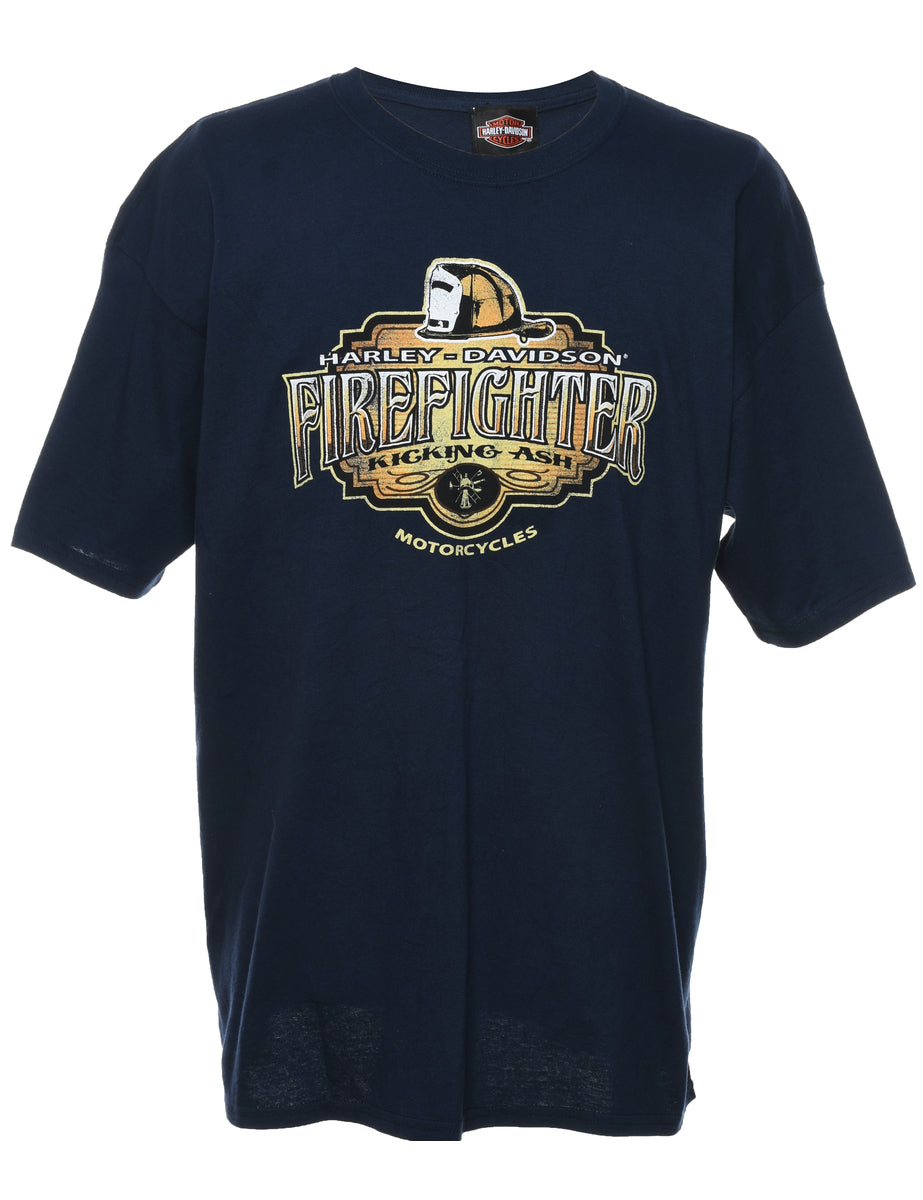 Harley Davidson fire fighter kicking ash printed t-shirt in navy with a drop shoulder.