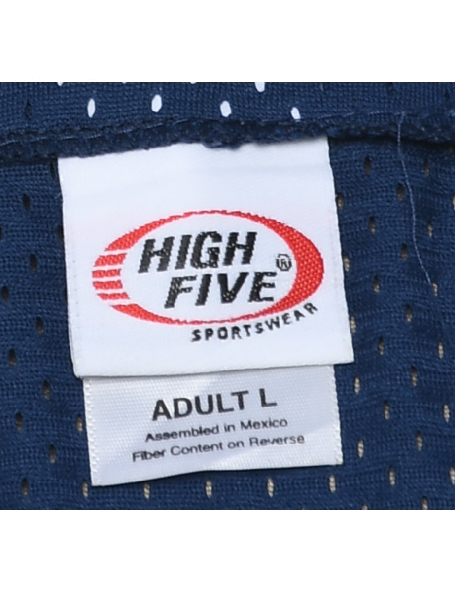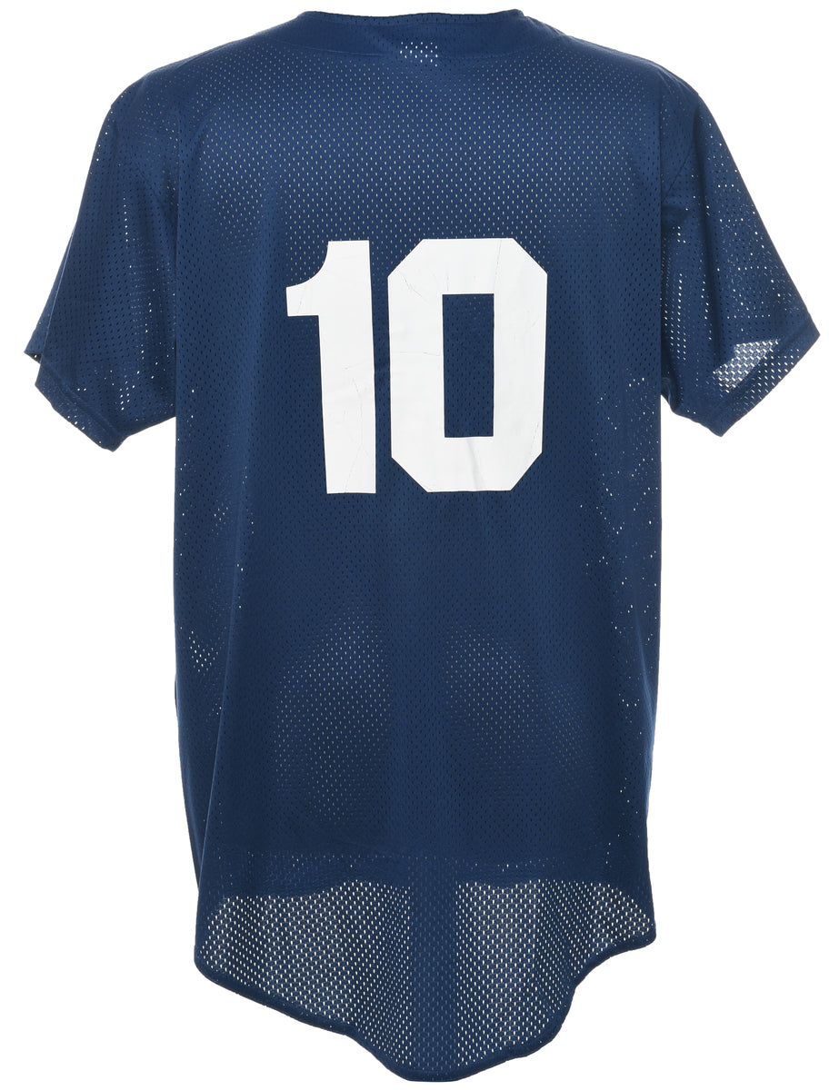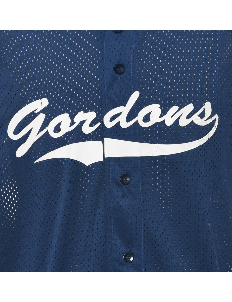 Mesh gordons printed t-shirt comes in navy with a v-neck.