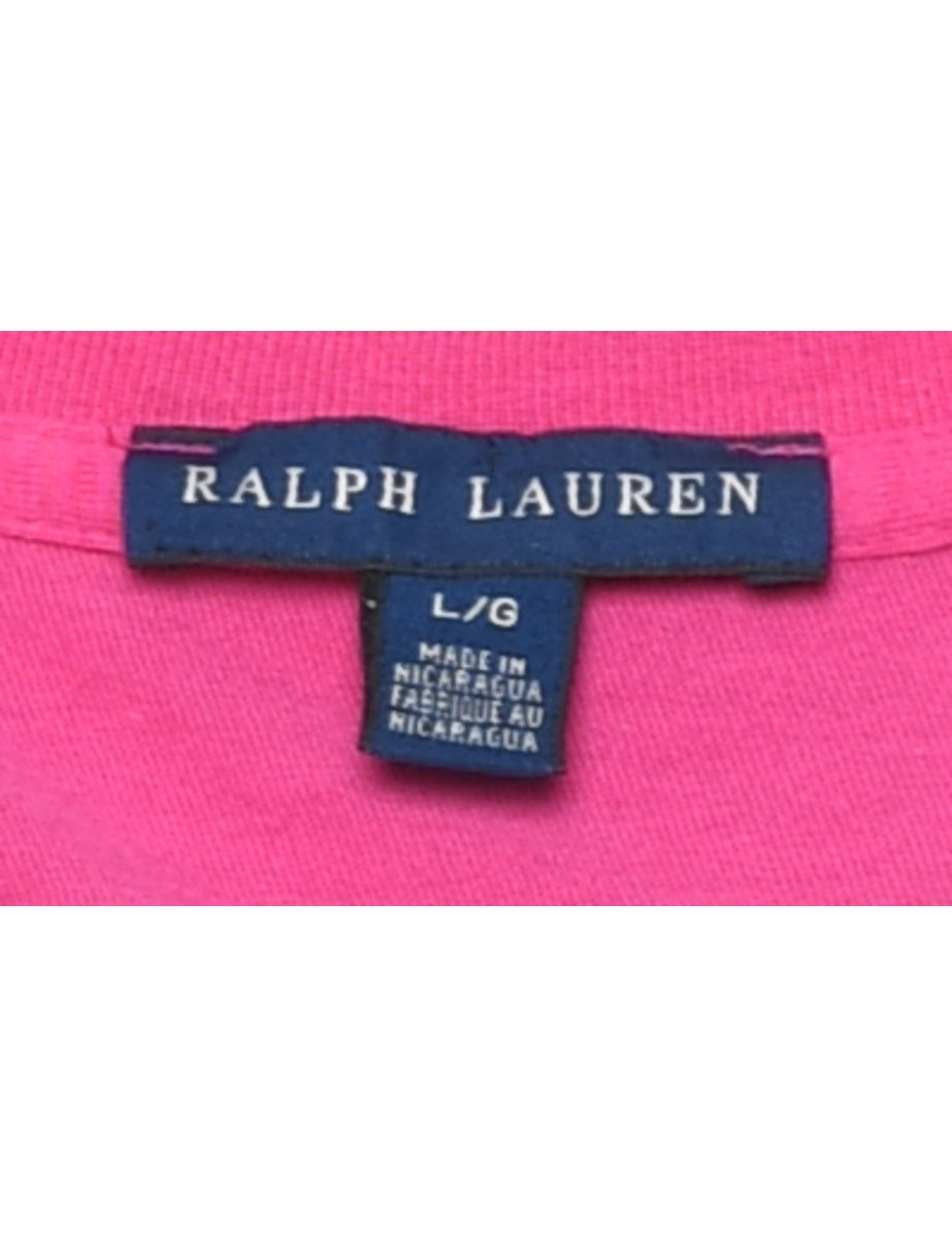 Ralph Lauren striped printed t-shirt in hot pink with a v-neck. The size label mentions L but based on the actual measurements we consider it a size M.