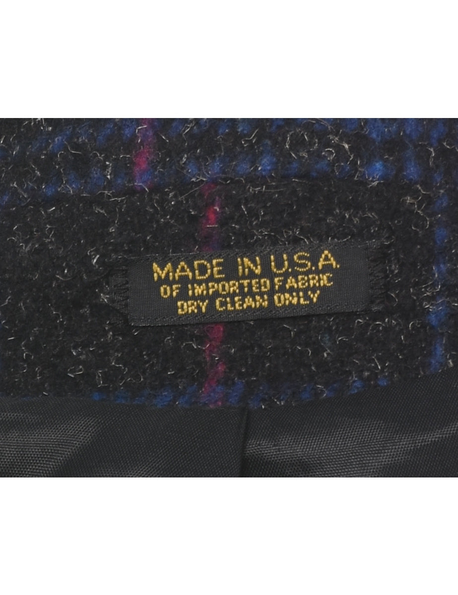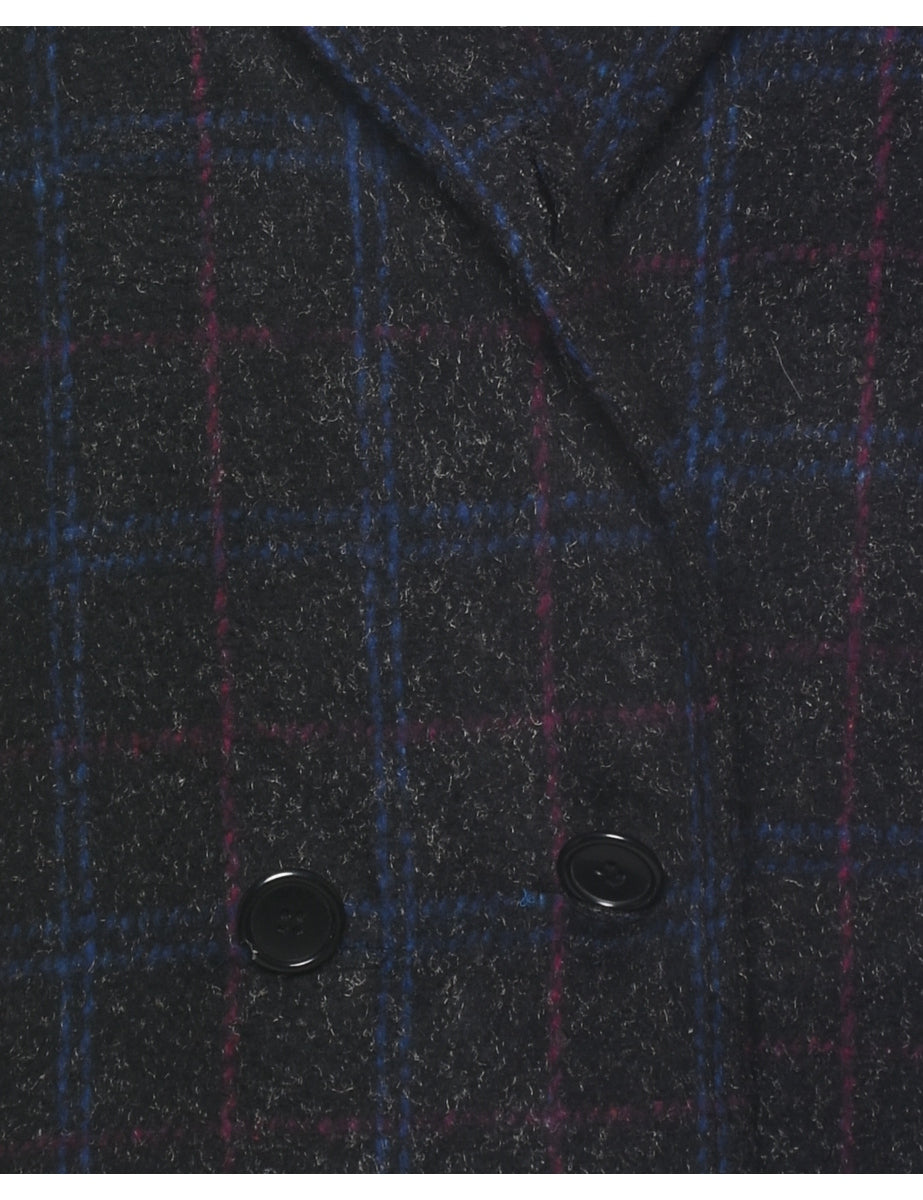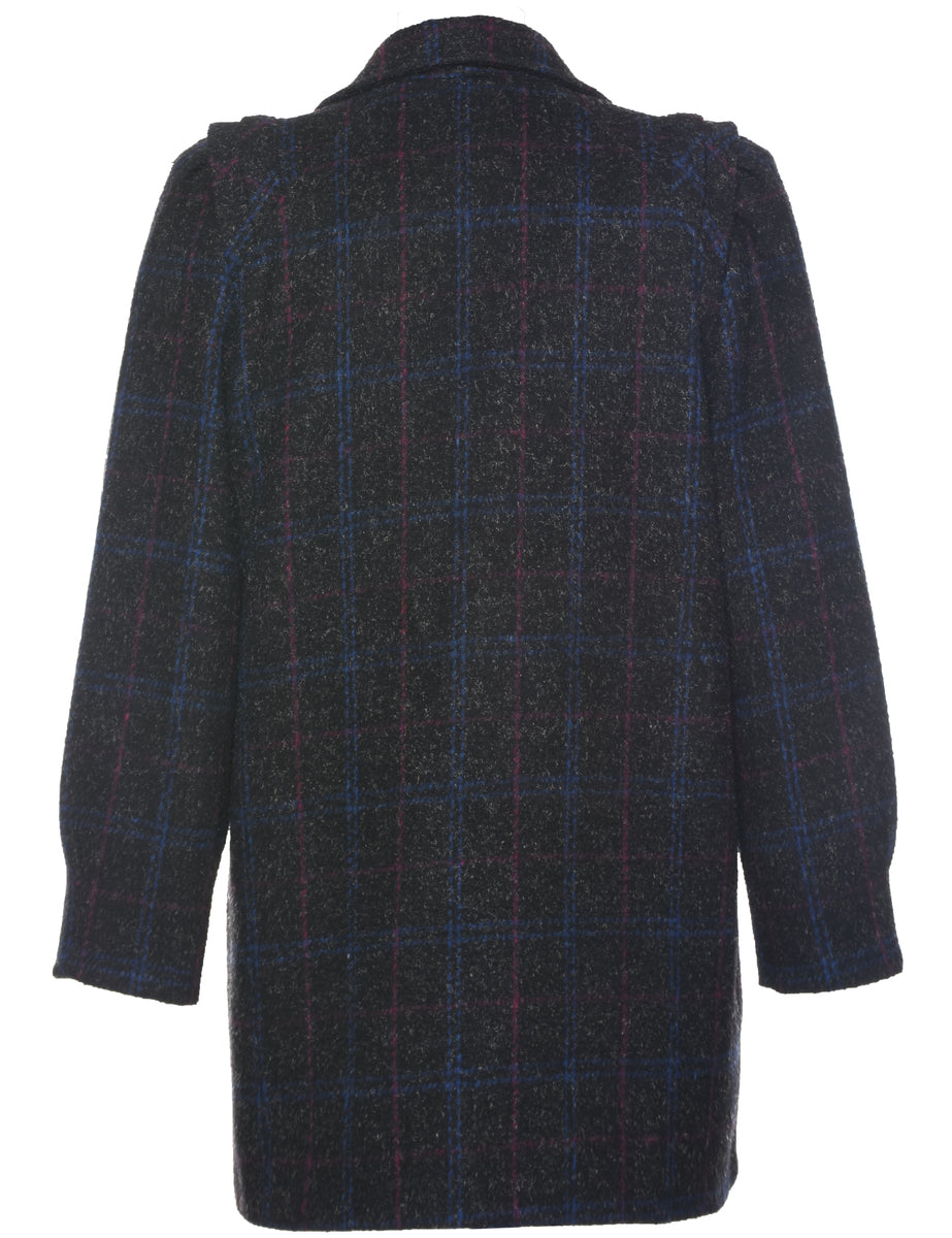Checked trench coat comes in black with multiple pockets and removable shoulder pads.