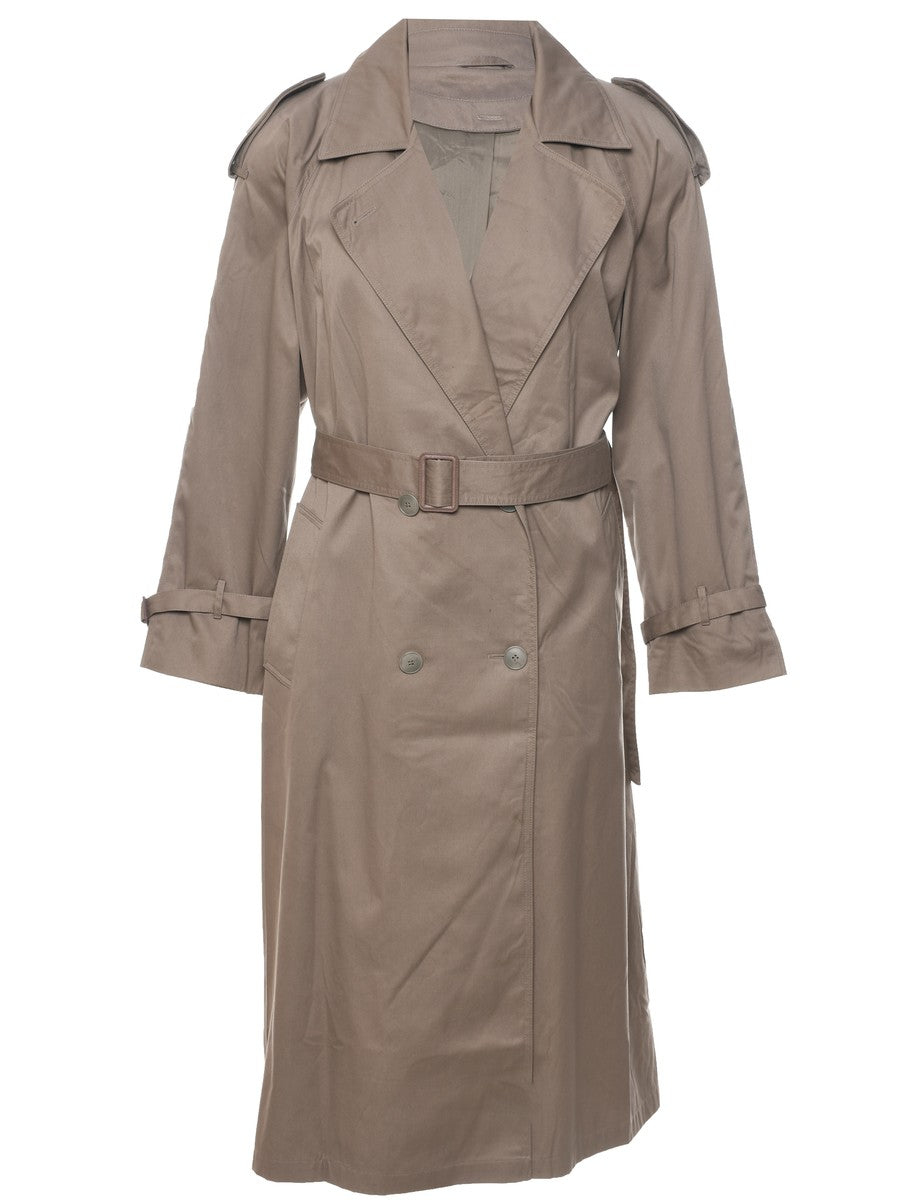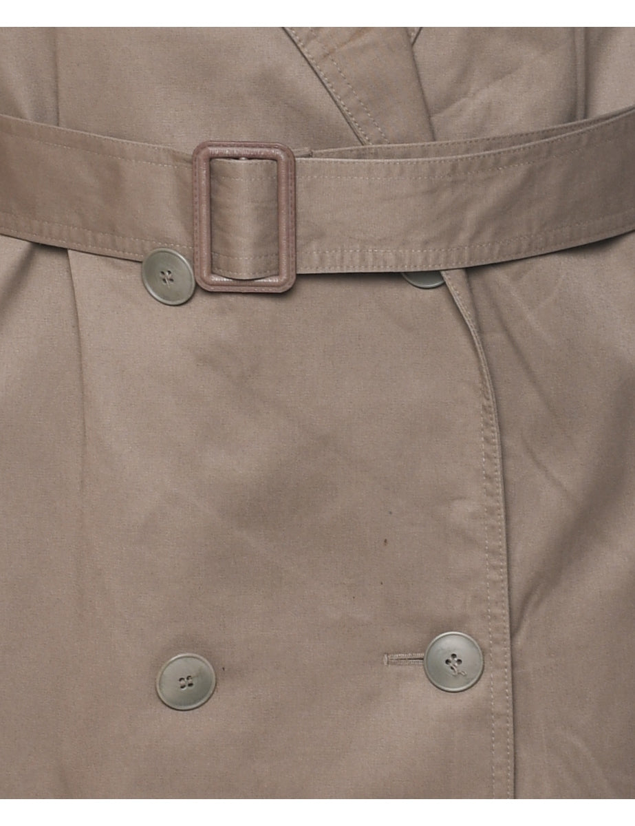 Double breasted trench coat. Comes in beige with epaulettes and multiple pockets.