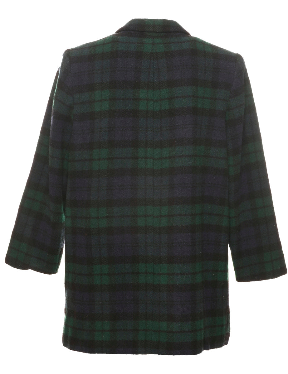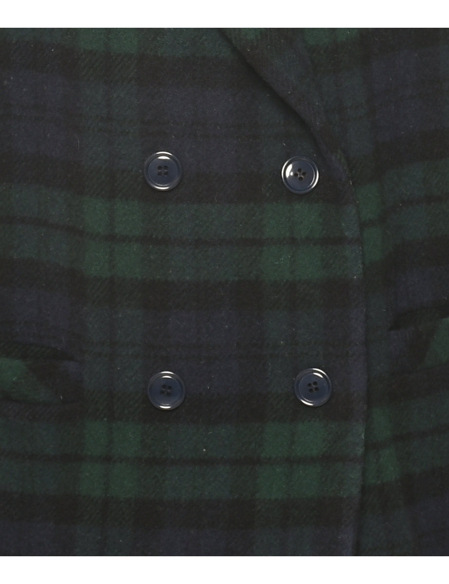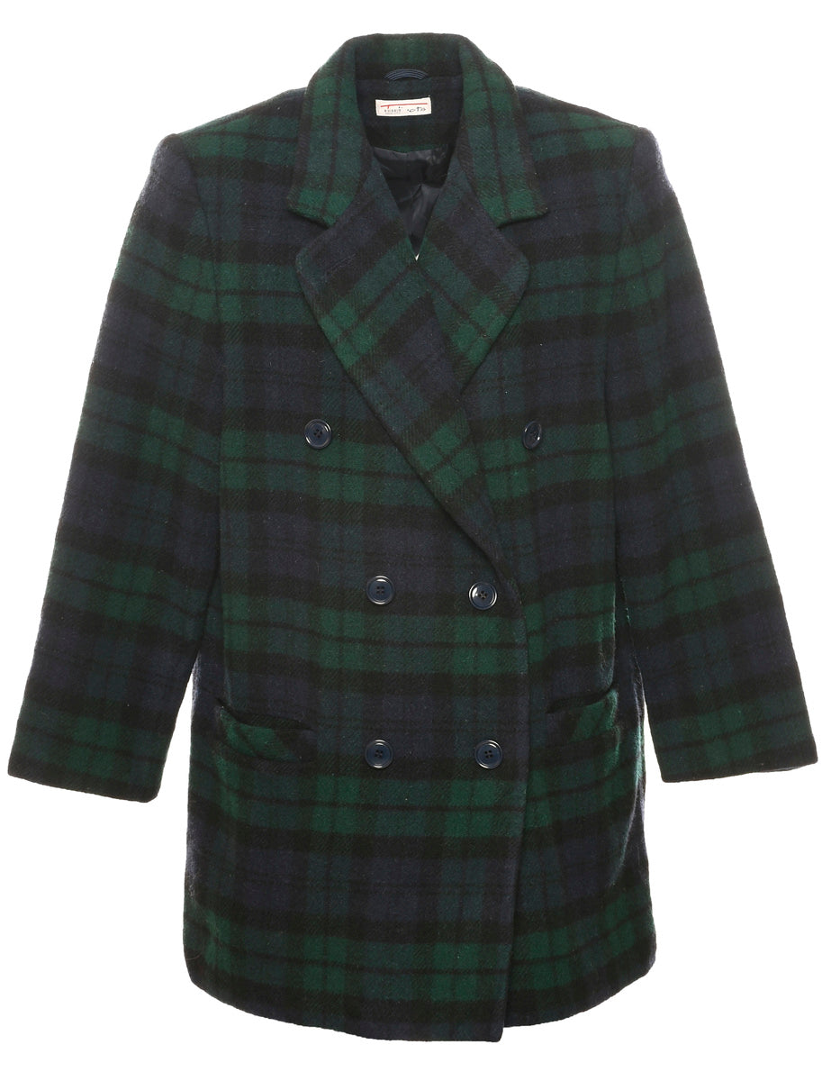 Tartan wool coat comes in navy & dark green with multiple pockets and built in shoulder pads.