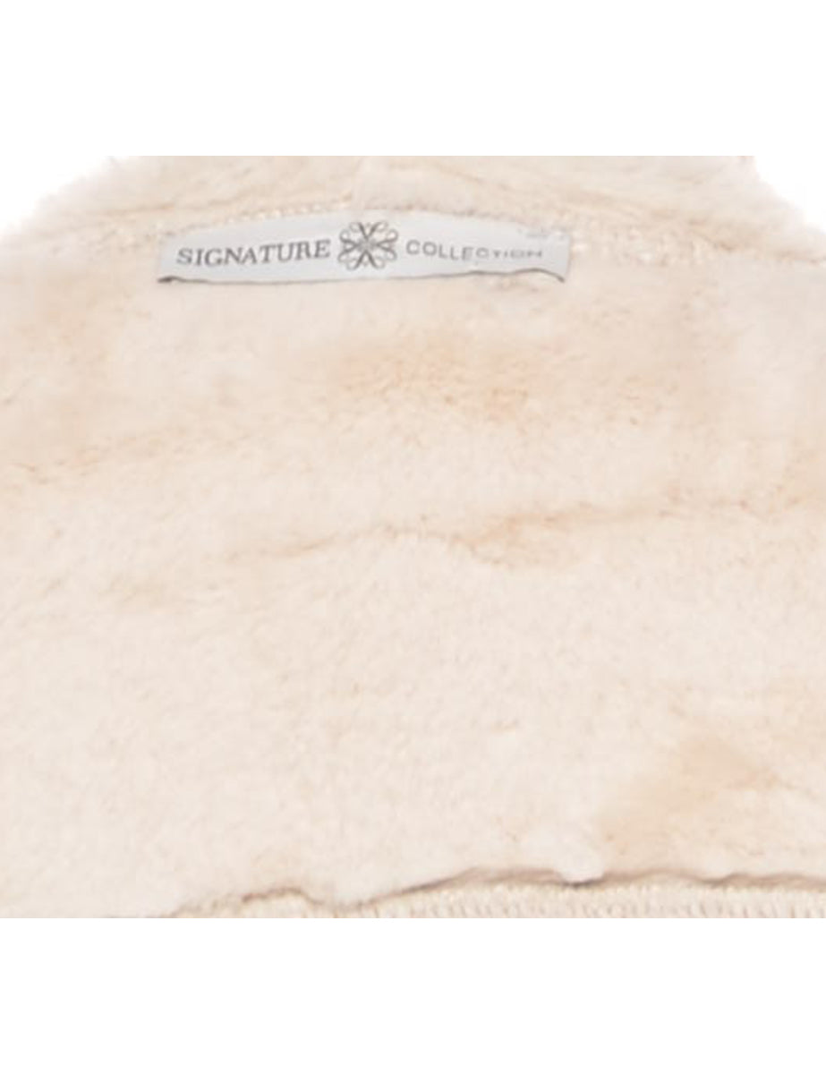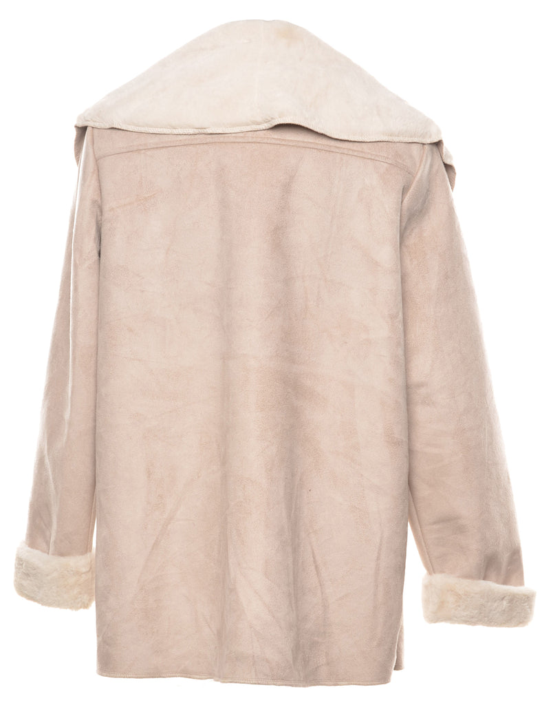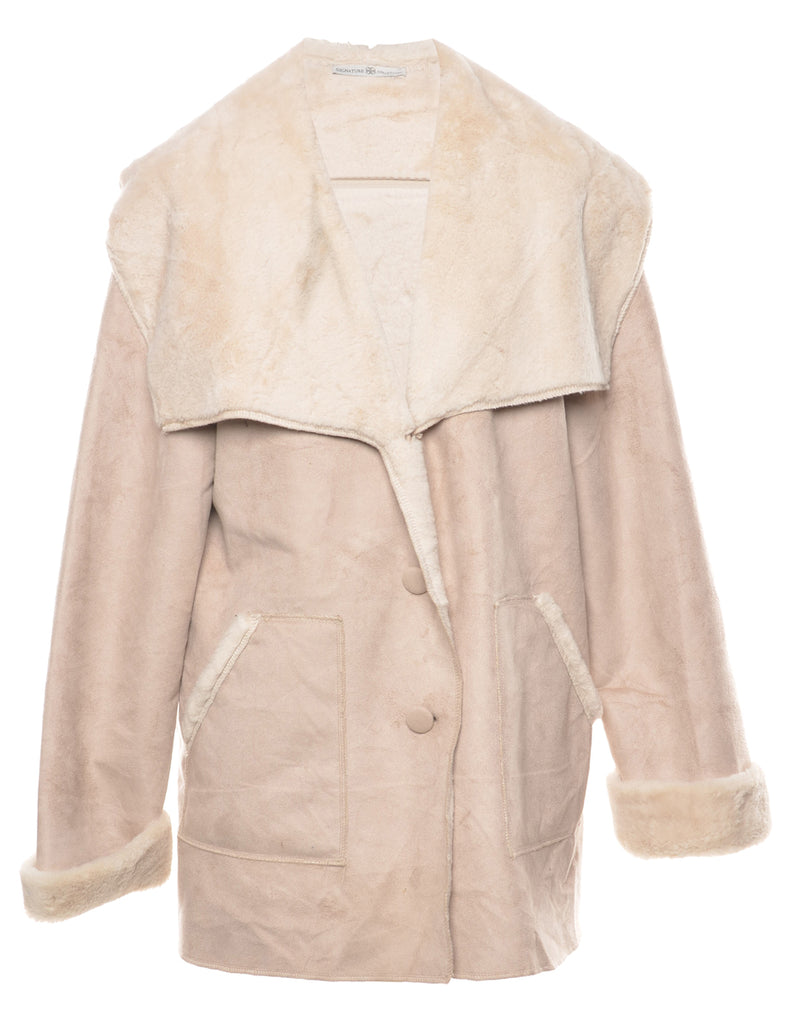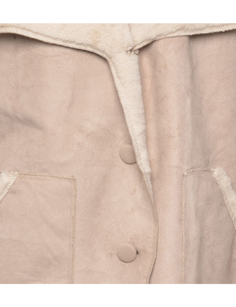 Single breasted beige midi length coat with a faux fur collar and faux fur lining.