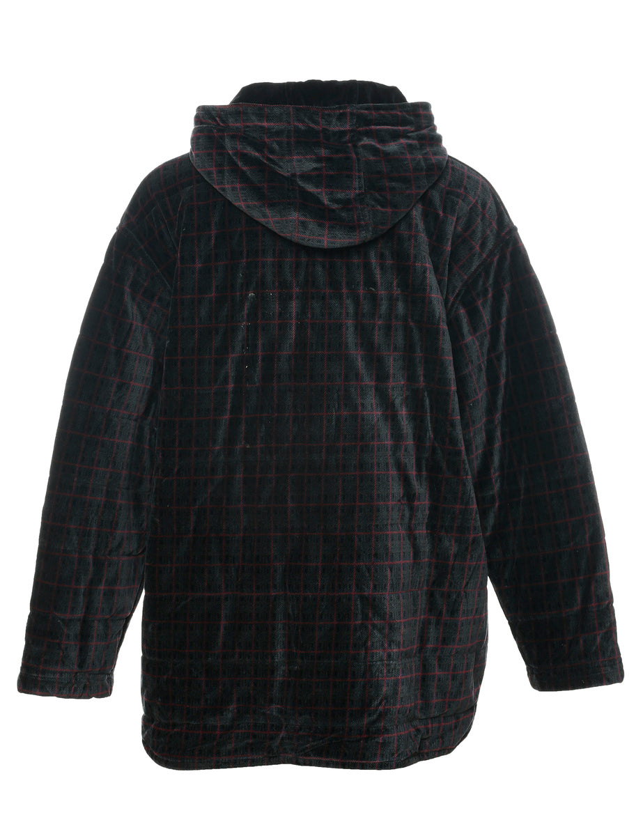 Hooded coat with checked pattern. Comes in black with multiple pockets.