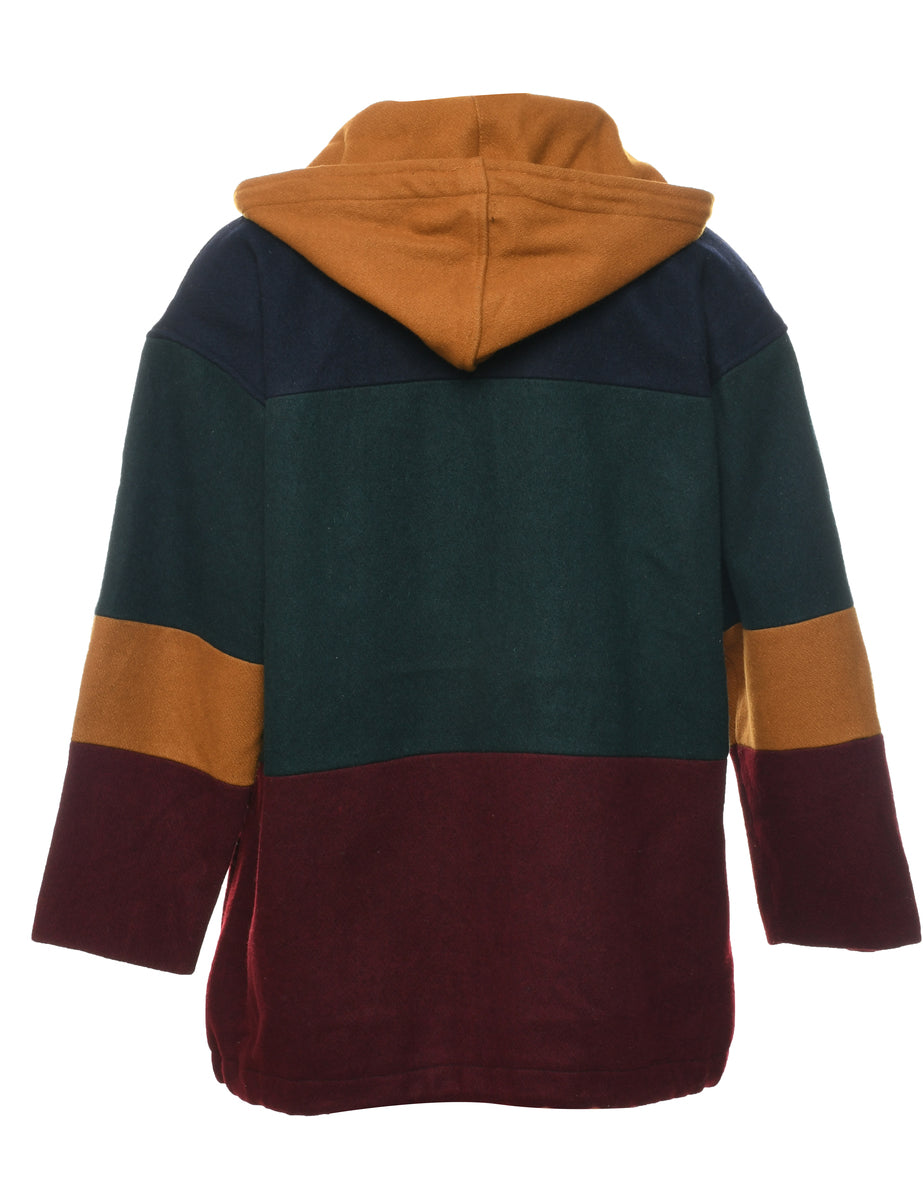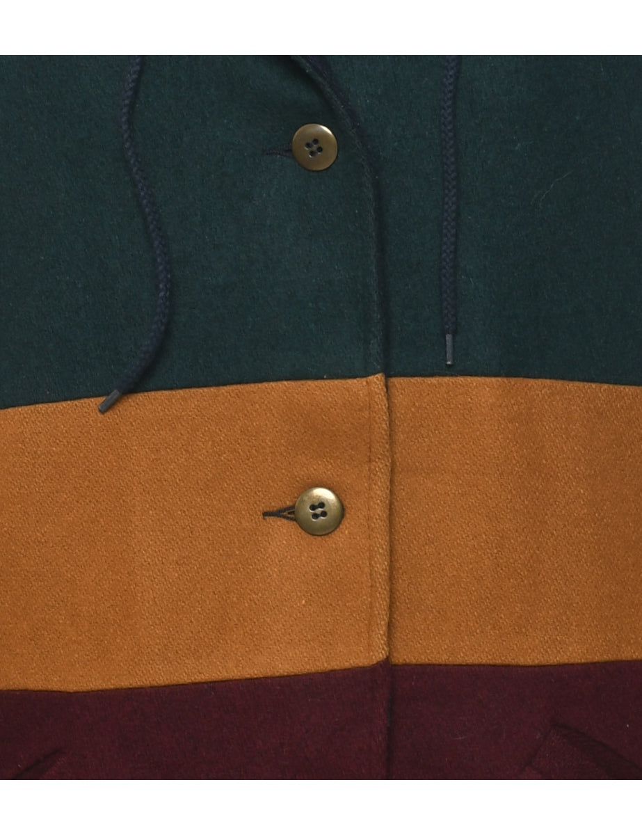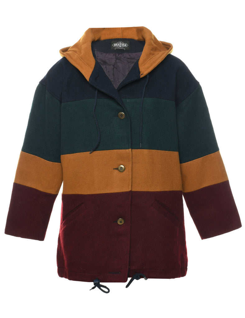 Hooded wool coat in multi-colour with multiple pockets and built in shoulder pads.