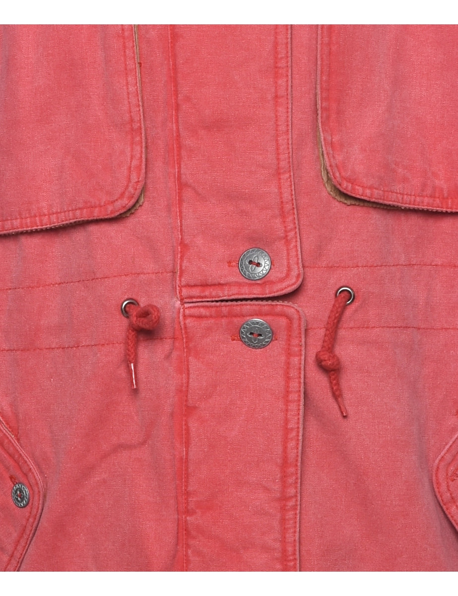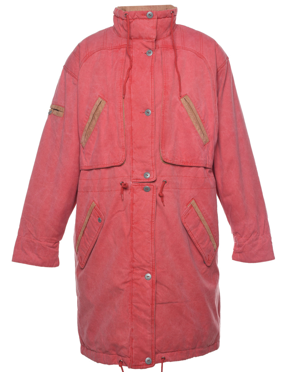 Single breasted pale pink coat with contrasting collar and multiple pockets.