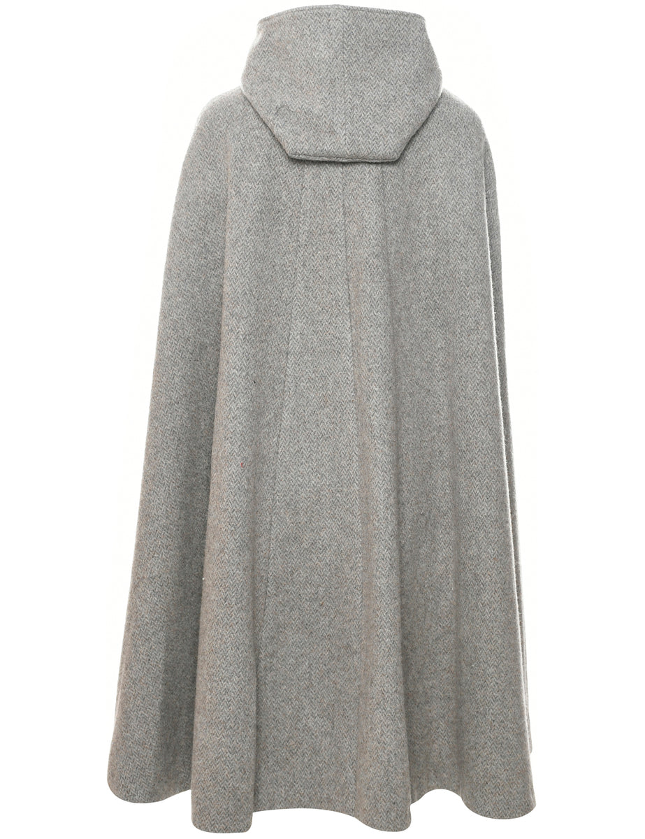 Single breasted cape comes in grey with a hood and multiple pockets.