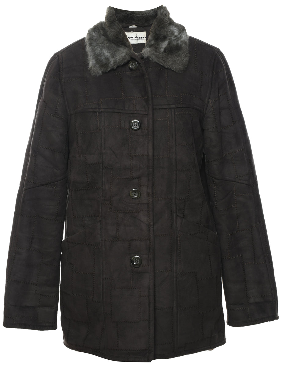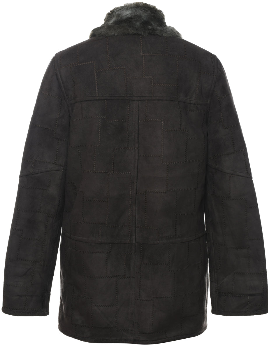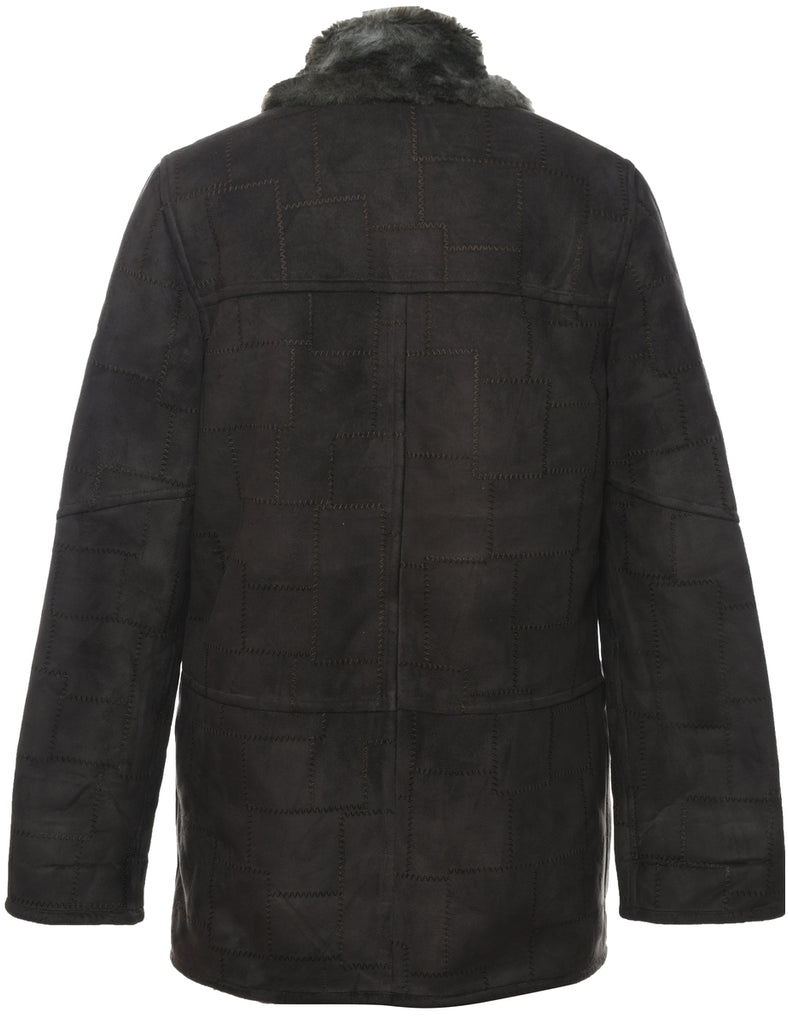 Single breasted jacket in olive green with faux shearling lining and multiple pockets.