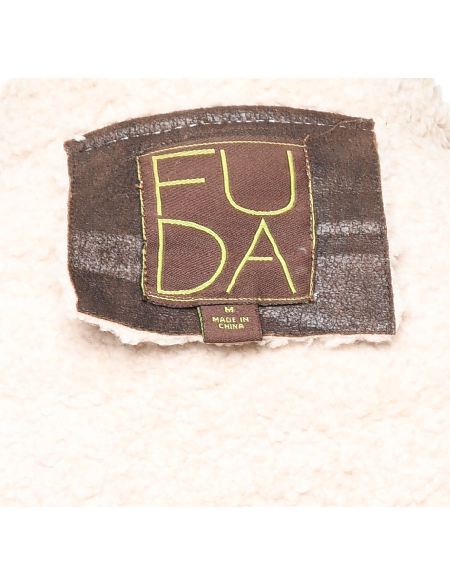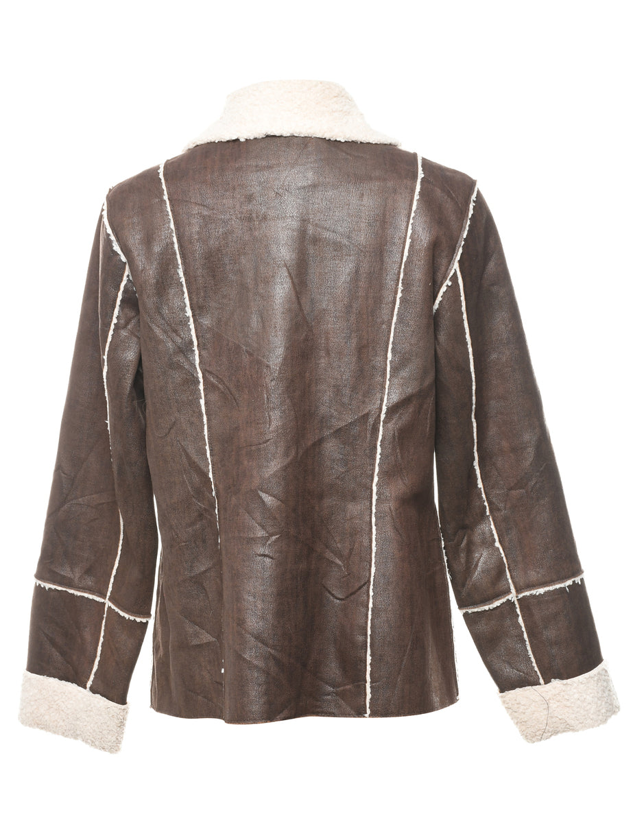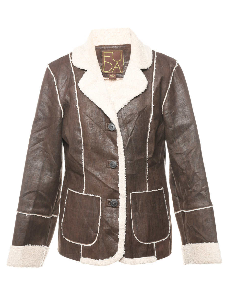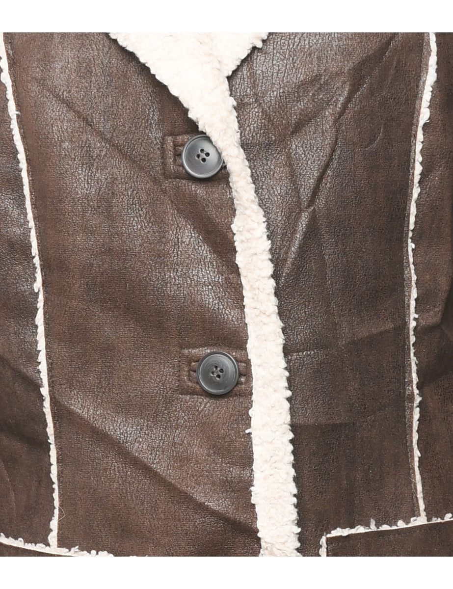 Single breasted coat in dark brown with shearling lining and multiple pockets.