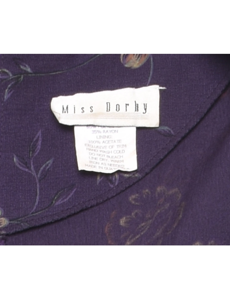 Floral print dress comes in purple with back tie and removable shoulder pads.